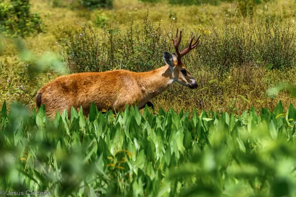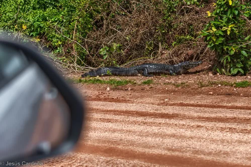 Pasamos la puerta de entrada a la Transpantaneira sobre las 9, todavía no hace mucho calor o tal vez sea que llevamos aire acondicionado, jeje, este lado del pantanal sí que es un verdadero pantanal, todo lo que rodea la carretera está bajo el agua, todo está verde, los árboles no son muy altos pero la vegetación está muy tupida, también hay grandes extensiones para pastos pero más cerrado. Abrimos bien los ojos para ver si hay suerte y ver algo. Lo primero un gran caimán a un lado de la carretera después muchos pájaros, garzas, jabirú y un gran venado. Cada vez que abríamos las puertas o la ventanilla nos comían los mosquitos. Hay numerosos puentes, todos los primeros están hechos de cemento y buen forjados, la carretera de tierra es ancha y no está en malas condiciones, algo de barro.