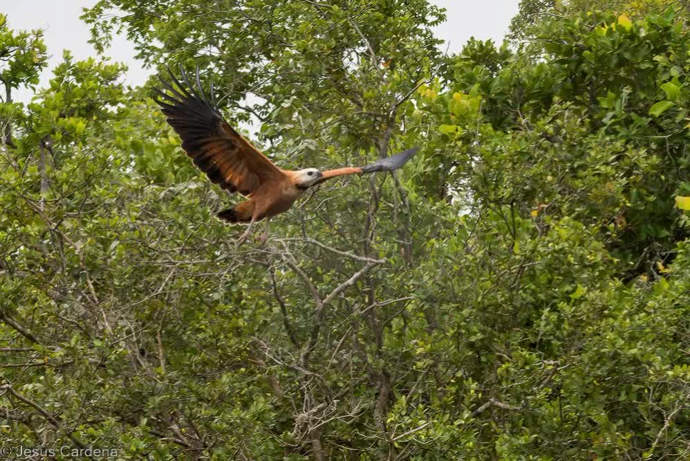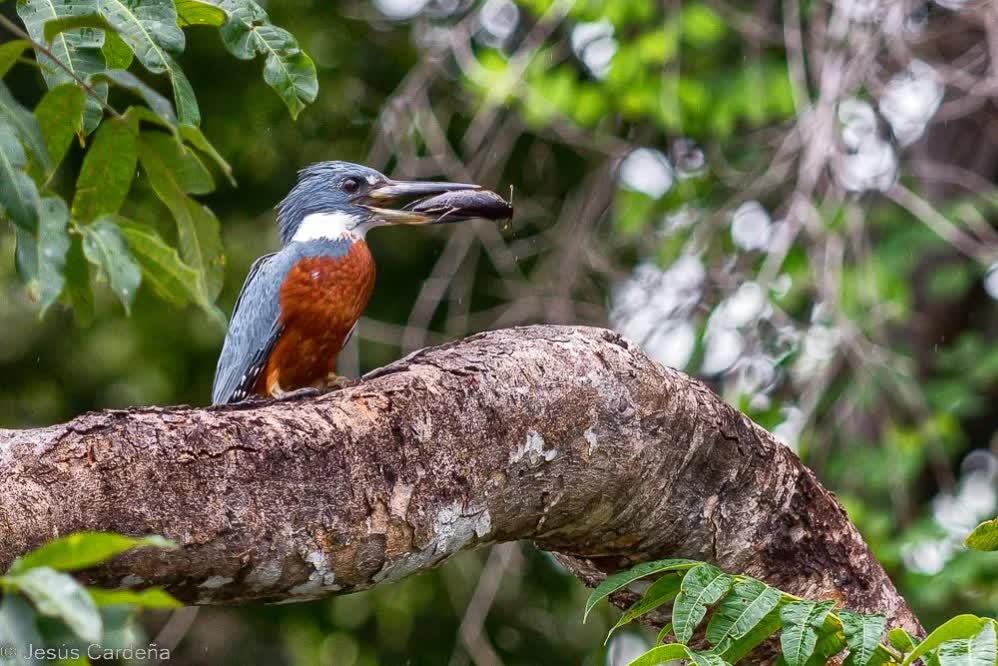 Tenemos el paseo a las 8.30, sólos y el barquero que no guía, damos un paseo por el Río Claro de más de 2 horas, es muy bonito, no vemos muchas cosas pero merece la pena, tienen localizadas varias águilas pescadoras que las dan de comer, el águila se lanza a por el pescado en el agua con las garras. También tienen localizado un caimán, “Filipino”, que acude a las llamadas del barquero y se lleva su cabeza de pescado cómo recompensa. Oímos de lejos al mono aullador pero no vemos ninguno, hay muchos Martín Pescador gigante y muchas aves acuáticas.