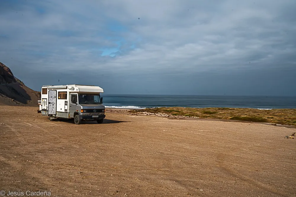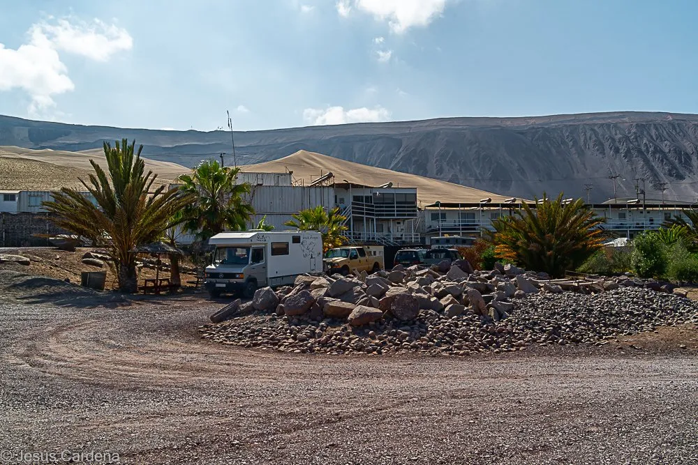 Llevamos el coche de alquiler a las oficinas del aeropuerto, llenamos gasoil y salimos de Arica, primer día de bajada, sabemos que los primeros 100 km son duros porque tienes que salvar 3 valles, subidas y bajadas con mucho desnivel acumulado, la primera muy bien pero en la segunda comienza la Merche a fallar, se queda sin fuerza, paramos una vez y parece que se recupera y consigue llegar arriba pero tras otro fallo nos empieza a sonar distinta y Jesús para, llama a Jose del Alamo,el mecánico de Aranjuez, y le dice que tiene que ir haciendo, está seguro que es obstrucción pero hay que saber dónde está. Desarma la toma de gasoil, limpia todos los conductos, etc. Después de 3 horas, monta de nuevo todo y volvemos a intentarlo, suena algo diferente pero va bien y no vuelve a fallar, bajamos a la población de Camarones, son ya las 5 de la tarde y sin comer, así pues decidimos entrar de nuevo en la caleta y dormir allí.