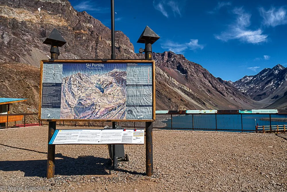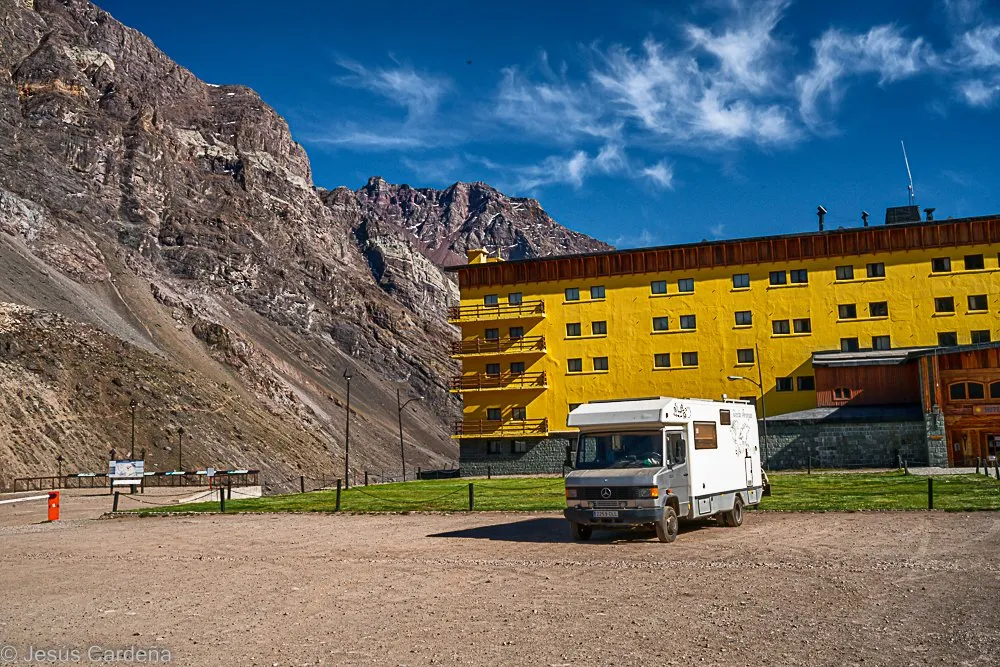 Al día siguiente seguimos esperando, Jesús hace fotocopias, última compras y de repente miramos en la web y ya está el certificado, descargamos todo y salimos a la frontera. Queríamos dormir antes de comenzar a subir el puerto Caracoles, una subida de 3,143 Km con una ganancia de altura de 800 metros llegando a los 3.200 msnm, pero no encontramos ningún buen sitio así que comenzamos a subir ese impresionante puerto rodeados de camiones subiendo esa cuesta llena de curvas cerradas. La carretera no está muy mal y es ancha. Llegamos al Portillo, zona de Esqui con un gran hotel ahora cerrado pero con un buen aparcamiento y lo que es mejor, alejado de la ruta desde el que no se oyen los camiones que continuamente pasan. Noche estrellada y fría, última noche en Chile!!!!