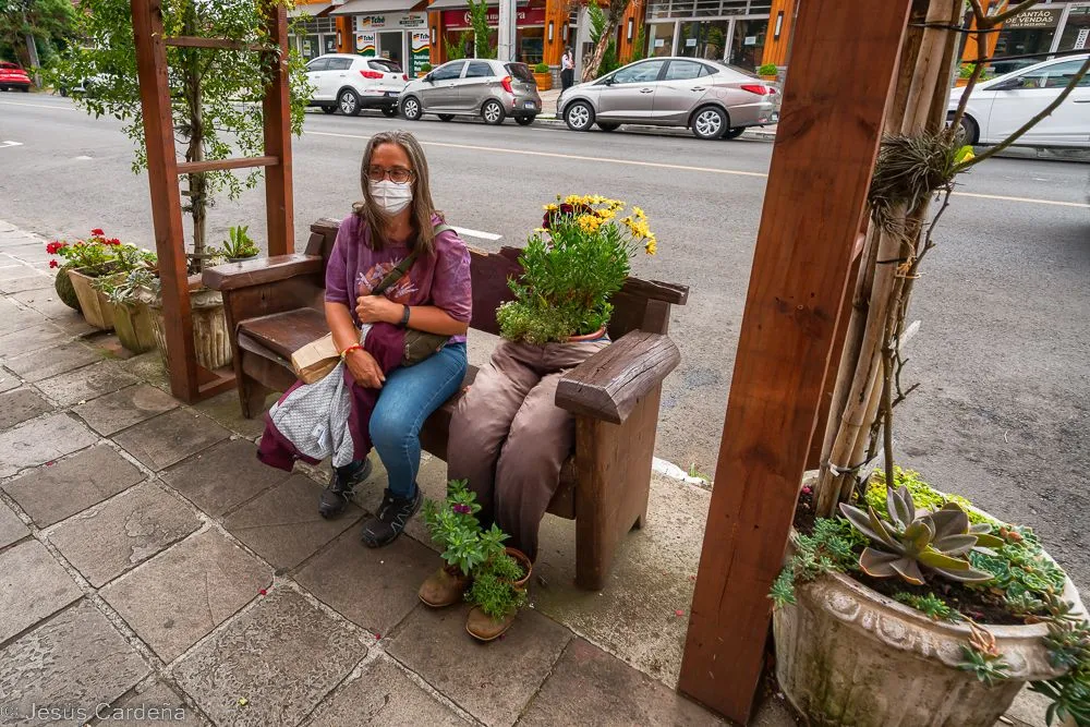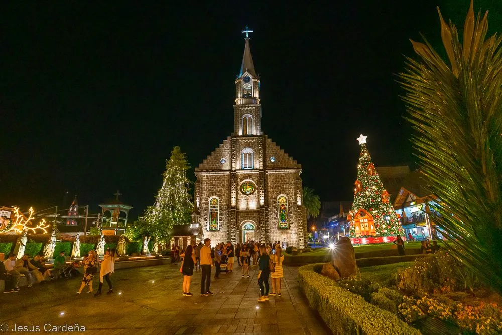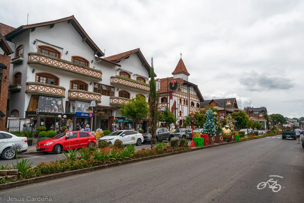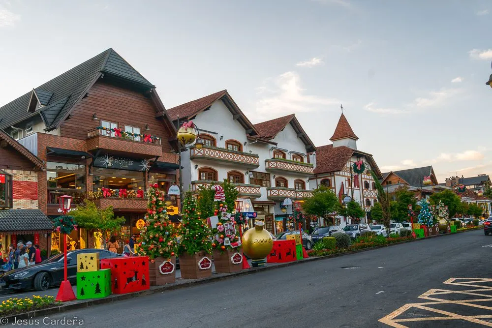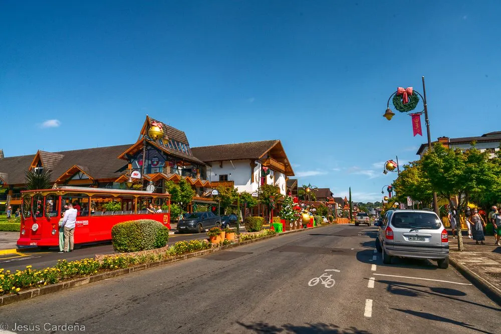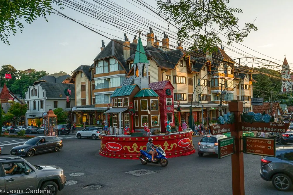 En cuanto desayunamos cogemos un taxi y vamos al hotel de los tíos José y Puri. Está en el centro de Gramado, en la calle principal. Damos una vuelta para conocerlo, Gramado es un pueblo muy turístico preparado para las compras y lleno de actividades para los niños y no tan niños. Numerosos restaurantes y chocolaterías y decoración navideña muy bonita. Las edificaciones son de estilo alemán, de hecho es una ciudad fundada por alemanes. Damos una vuelta, comemos, intentamos arreglar lo del chip del teléfono aunque pasarán unos días hasta tener las dos tarjetas en funcionamiento. Compramos también unos pasajes de bus turístico para dos días. Hace calor pero en la noche enseguida refresca. Cuando anochece hay un encendido de luces de los edificios, hay mucha gente apilada, José como un niño quiere verlo de cerca.