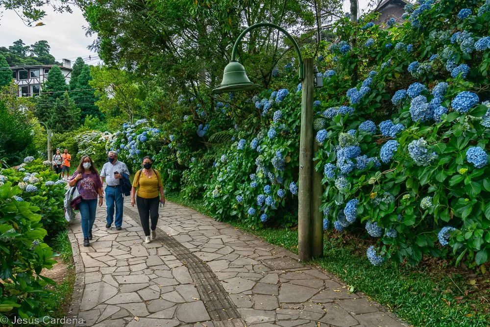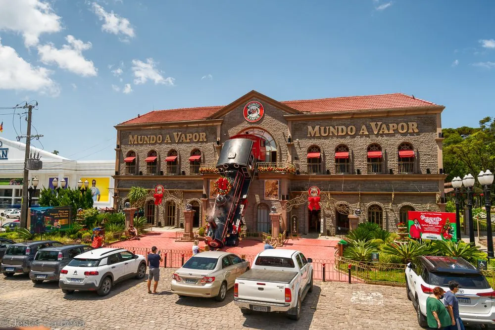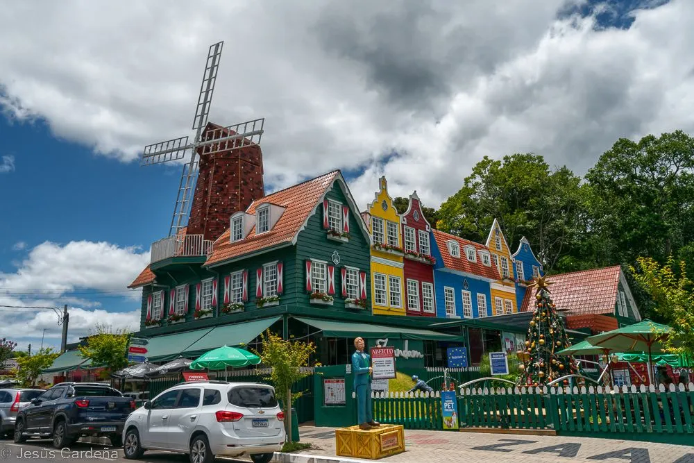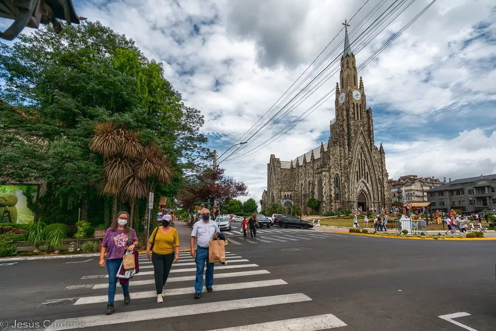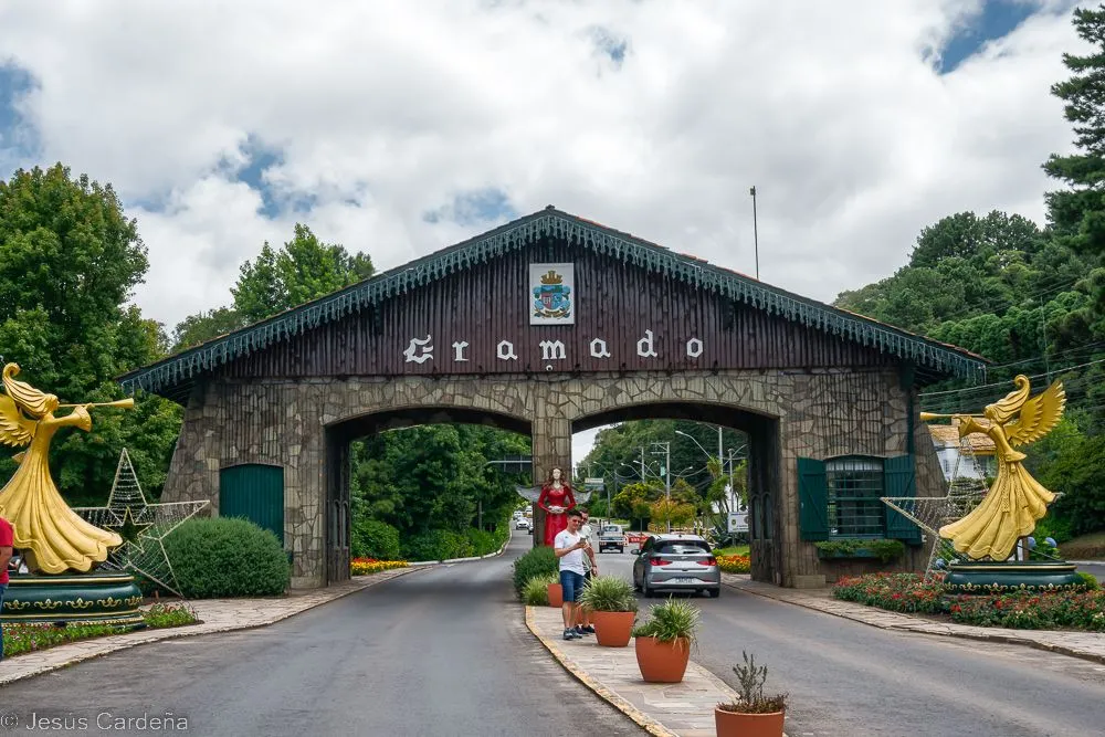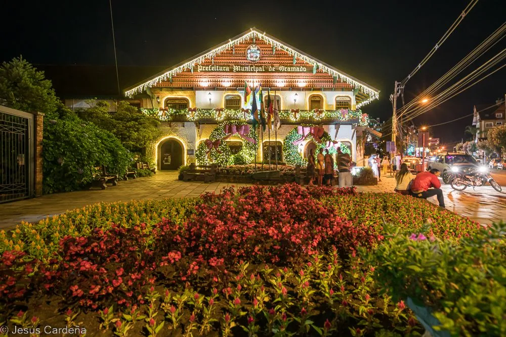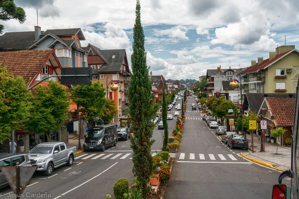 En cuanto desayunamos cogemos un taxi y vamos al hotel de los tíos José y Puri. Está en el centro de Gramado, en la calle principal. Damos una vuelta para conocerlo, Gramado es un pueblo muy turístico preparado para las compras y lleno de actividades para los niños y no tan niños. Numerosos restaurantes y chocolaterías y decoración navideña muy bonita. Las edificaciones son de estilo alemán, de hecho es una ciudad fundada por alemanes. Damos una vuelta, comemos, intentamos arreglar lo del chip del teléfono aunque pasarán unos días hasta tener las dos tarjetas en funcionamiento. Compramos también unos pasajes de bus turístico para dos días. Hace calor pero en la noche enseguida refresca. Cuando anochece hay un encendido de luces de los edificios, hay mucha gente apilada, José como un niño quiere verlo de cerca.