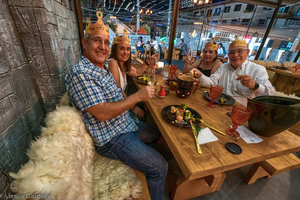 Pasamos la mañana en el camping y en la tarde hemos quedado con los tíos para tomar las uvas a las 24 horas de España, cruzando los dedos para poder hacer una video-llamada con la familia en España. La conexión es un éxito y podemos tomar las uvas con ellos y brindar con espumoso. Ha sido muy emociónate ver a la familia reunida y poder recibir el año viéndolos, aunque fuera a través de una pequeña pantalla de teléfono. A continuación nos vamos al restaurante que ha reservado José, vamos a pasar la noche en un restaurante ambientado como castillo medieval. El menú es el típico de Gramado, fundé de quesos, de carne y de chocolate con frutas. Tanto se extiende la cena que llegamos a las 12 de la noche sin parar de comer. En Brasil es típico vestir de blanco y celebrar con brindis y pólvora. Los camareros y camareras van vestidos con ropa estilo medieval y de vez en cuando pasan cantando y bailando. Una agradable noche vieja junto a los tíos Puri y José María.