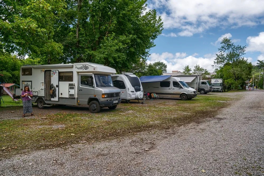 Salimos pronto hacia Gramado, pero vamos a comprar y nos entretenemos bastante, camino largo y carreteras malas pero el paisaje se vuelve más montañoso y verde. Llegamos tarde al camping que está lleno pero todavía quedan varios lugares, es un camping preparado para acoger grandes motorhome, hay muchos autobuses y grandes máquinas y también instalaciones fijas, aparte de tener agua, desagüe y algo de sombra, no tiene muchos más servicios.
