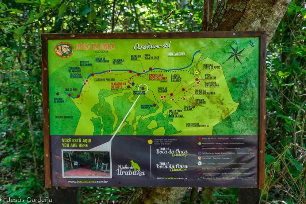 La cascada de Boca da Onça recibe ese nombre debido a una formación calcárea que tiene forma de cabeza de jaguar (onça en portugués). Toda la región está llena de tobas calcáreas (un tipo de formación rocosa), y esta es una de las más notables. El recorrido se realiza, en su inicio, bajando por el río Salobra al llegar a la cascada Boca da Onça se inicia una subida a base de escalones, total 886, Jesús lo pasa bastante mal con su rodilla, se resiente mucho y tiene que ascender muy despacio.