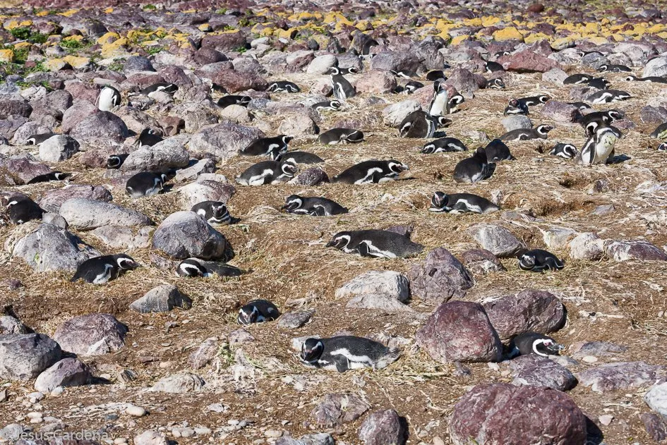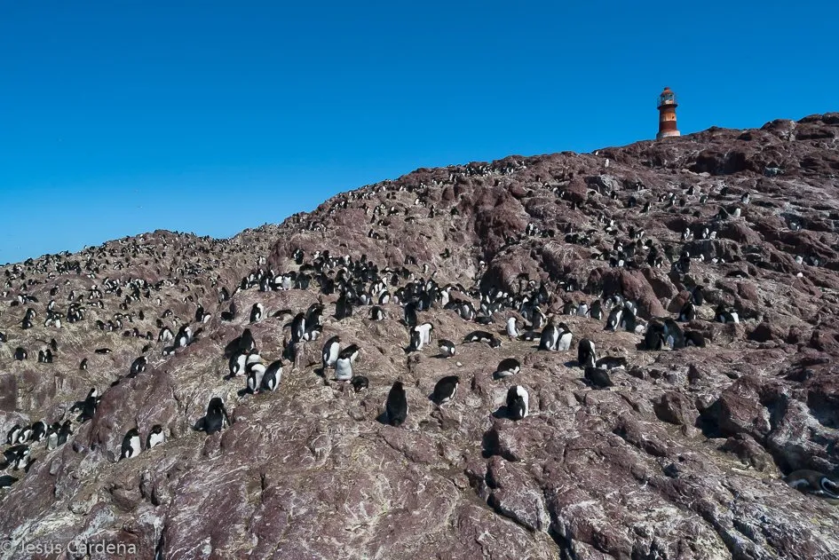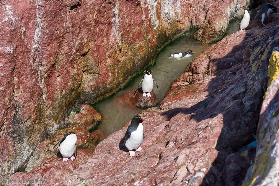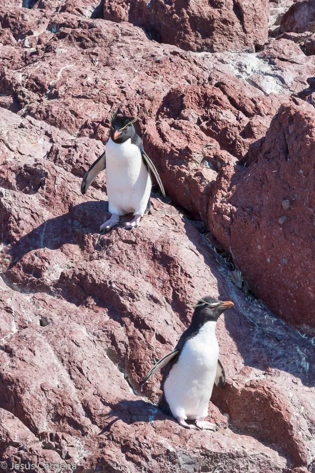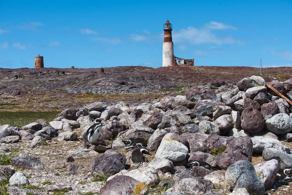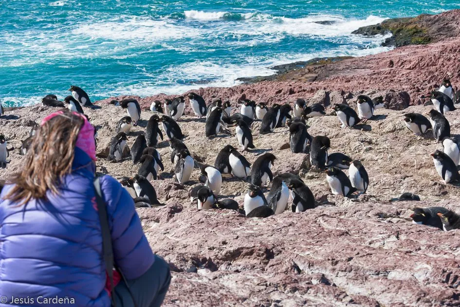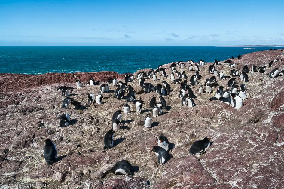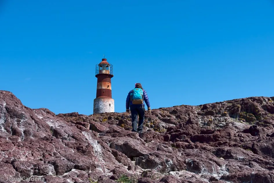 Por fin el día, hemos quedado a las 8 en el embarcadero, solo seremos 8, el capitán y su mujer que es la guía. La excursión va a ser muy agradable sin tanta gente. Día luminoso, despejado pero muy frío, vamos bien abrigados. El viento en la semirrígida es muy fuerte. Saliendo de la ría vemos alguna tonina y mucha diversidad de aves. La navegación dura 50 minutos hasta llegar a Isla Pingüinos donde nos espera, en su costa, un grupo de Lobos Marinos tomando el sol. Sobre una colina, el faro, ya no está en funcionamiento, es alto. Subimos a la colina del faro y pasamos a su lado para cruzar al lado sur de la isla donde está la colonia de pingüinos de penacho amarillo. Son muy bonitos, un poco más pequeños que el Magallanes, tiene el penacho amarillo saliendo como dos crestitas a los lados, unos ojos rojos un punto malvado y punky. Pasamos más de una hora viendo a estas graciosas aves moverse entre las rocas y cuidar de sus huevos. De vuelta al barco un paseo agradable entre Scuas, que son como las gaviotas pero grises y nos atacan en vuelo rasante sobre nuestras cabezas para alejarnos de sus nidos.