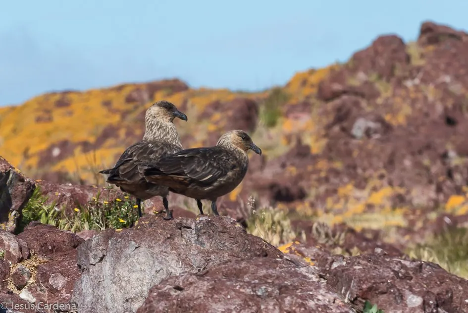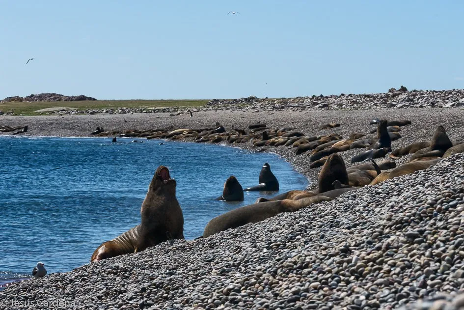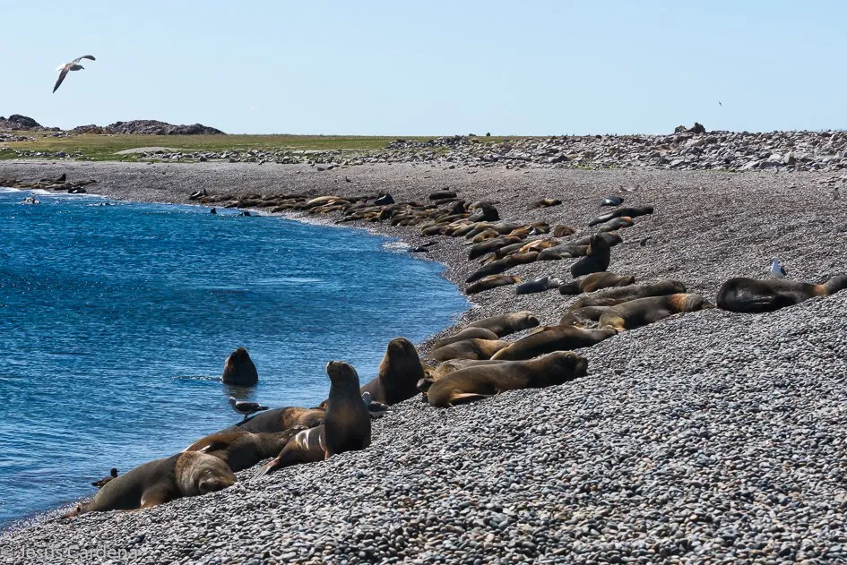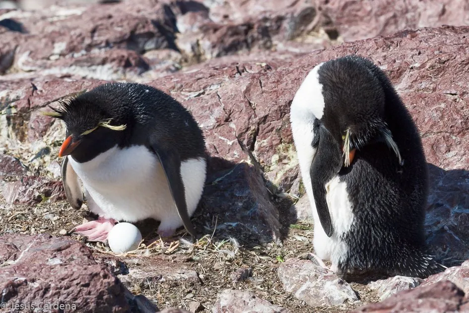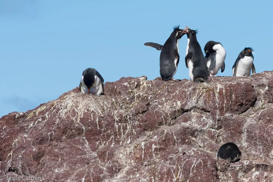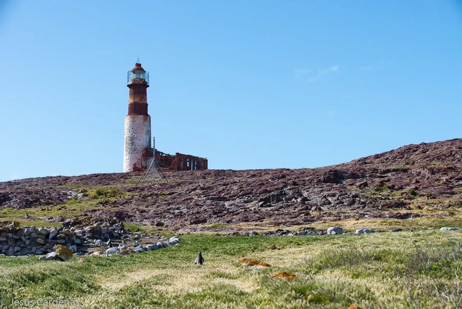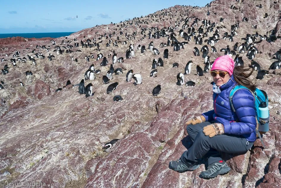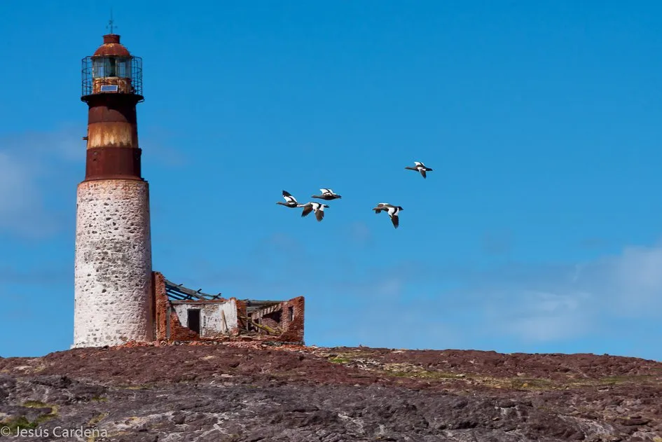 Por fin el día, hemos quedado a las 8 en el embarcadero, solo seremos 8, el capitán y su mujer que es la guía. La excursión va a ser muy agradable sin tanta gente. Día luminoso, despejado pero muy frío, vamos bien abrigados. El viento en la semirrígida es muy fuerte. Saliendo de la ría vemos alguna tonina y mucha diversidad de aves. La navegación dura 50 minutos hasta llegar a Isla Pingüinos donde nos espera, en su costa, un grupo de Lobos Marinos tomando el sol. Sobre una colina, el faro, ya no está en funcionamiento, es alto. Subimos a la colina del faro y pasamos a su lado para cruzar al lado sur de la isla donde está la colonia de pingüinos de penacho amarillo. Son muy bonitos, un poco más pequeños que el Magallanes, tiene el penacho amarillo saliendo como dos crestitas a los lados, unos ojos rojos un punto malvado y punky. Pasamos más de una hora viendo a estas graciosas aves moverse entre las rocas y cuidar de sus huevos. De vuelta al barco un paseo agradable entre Scuas, que son como las gaviotas pero grises y nos atacan en vuelo rasante sobre nuestras cabezas para alejarnos de sus nidos.