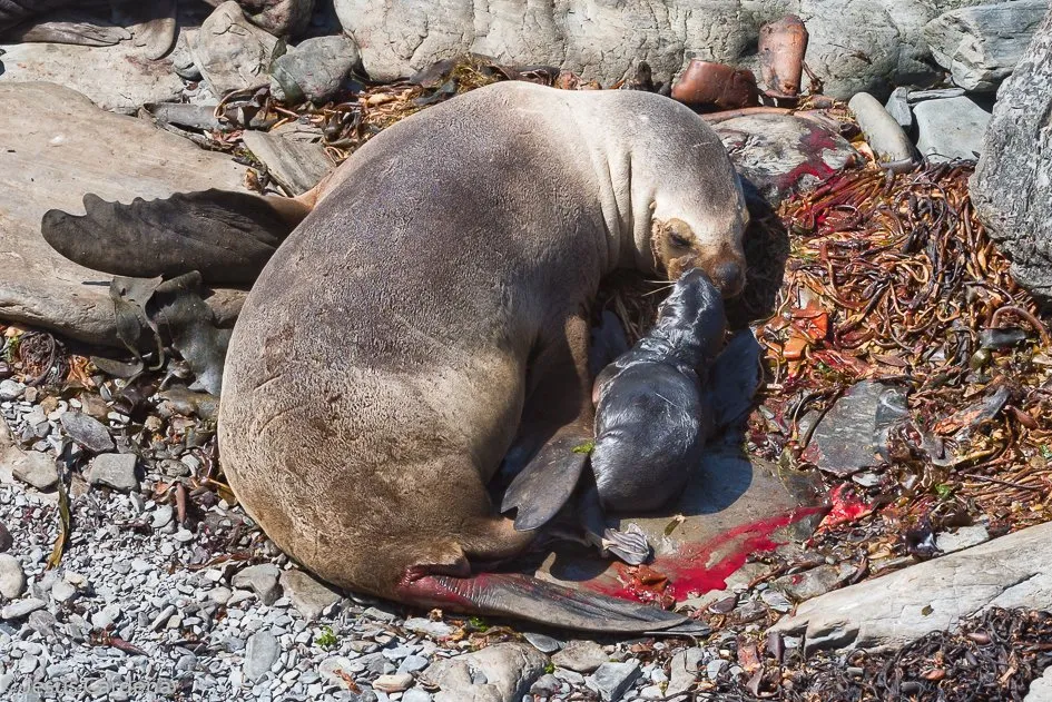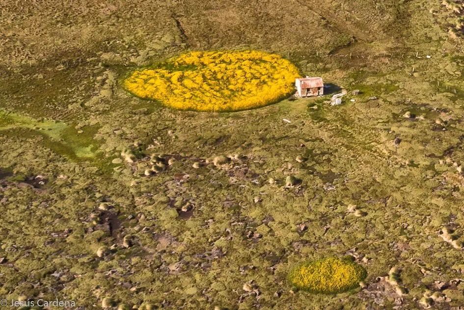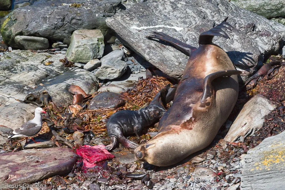 A la 9 sale la avioneta que nos llevará a Sea Lion Island así que desayuno, maletas y saliendo, esta vez no será más de 20 minutos de vuelo y vamos con otra pareja de ingleses muy agradables. Esta isla también antiguamente era estancia y de las que antes se poblaron, por su riqueza de pastos pero hoy en día es más una pequeña reserva protegida de otros animales no autóctonos y con un pequeño hotel que dicen de super lujo, a mí no me lo pareció, si es un lugar especial pero no lujoso y además seguimos compartiendo mesa con otros. La habitación es grade y con cama supletoria, el baño no es nada especial. Lo que tiene único es que desde las ventanas sur y salón tiene vistas a una enorme pinguinera de papuas, a solo 100 m de la puerta. La isla tiene forma alargada y nosotros estamos en un extremo, lo primero que hacemos es ir con la dueña a darnos una vuelta por los lugares que podemos visitar. Pprimero pasamos por la zona de los leones marinos que como en Bleaker es un acantilado pequeño, este un poco más alto y se ve peor pero hay muchos más, y lo mejor es que hay una pareja allí que nos explica que hacía 5 minutos acababa de nacer un lobito, están todos muy nerviosos, hay muchos machos en la discusión y las hembras con sus cachorros o todavía preñadas. Una hembra está especialmente inquieta y de repente aparece las aletas inferiores de una cría de lobo marino, está de parto, en un segundo sale y lo primero que hace la madre es quitarle la placenta de la cara, guau, los petreles y Squas disputándose la placenta, todo un espectáculo, pura naturaleza. Después nos acercamos a la punta este de la isla, zona de acantilado dónde está la colonia de pingüinos de penacho amarillo, un acantilado muy bonito y bastante escarpado donde suben y bajan saltando sin problemas, también hay cormoranes, es un sitio muy bonito pero está a 4 km del hotel por un camino no muy bonito por lo tanto nos volvemos con ella al.