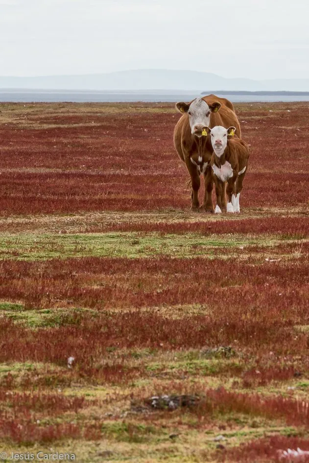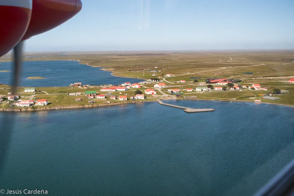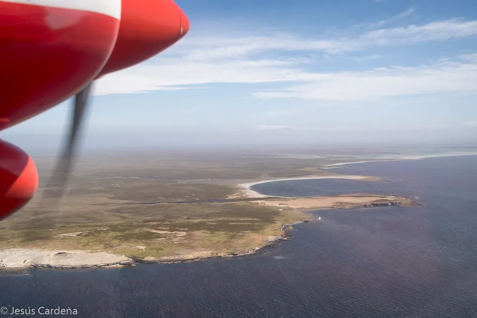 A las 7.45 nos esperan para ir al aeródromo que está a unos 10 minutos. Figas la única aerolínea de avionetas-taxi que opera en las Islas. Antes de subir pesan meticulosamente el equipaje y a nosotros, son avionetas que caben máximo 6 más piloto y copiloto. Vamos 4 personas, el día está soleado y sin aíre. Primero paramos en Darwin para recoger a dos personas más, el vuelo nos permite ver muchas islas, grandes, pequeñas, sin mucha elevación en ninguna de ellas y costas muy rocosas a excepción de largas playas de arena muy blanca. En más o menos 1 hora llegamos a la Isla Bleaker, nuestro primer destino. En casi todas las islas hay una estancia que contiene un pequeño complejo turístico y que eran antiguos criaderos de ovejas, ahora al caer el precio de de la lana, se dedican también a la cría de reses para carne.