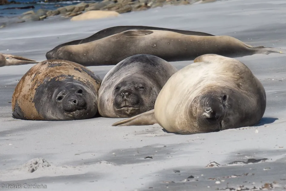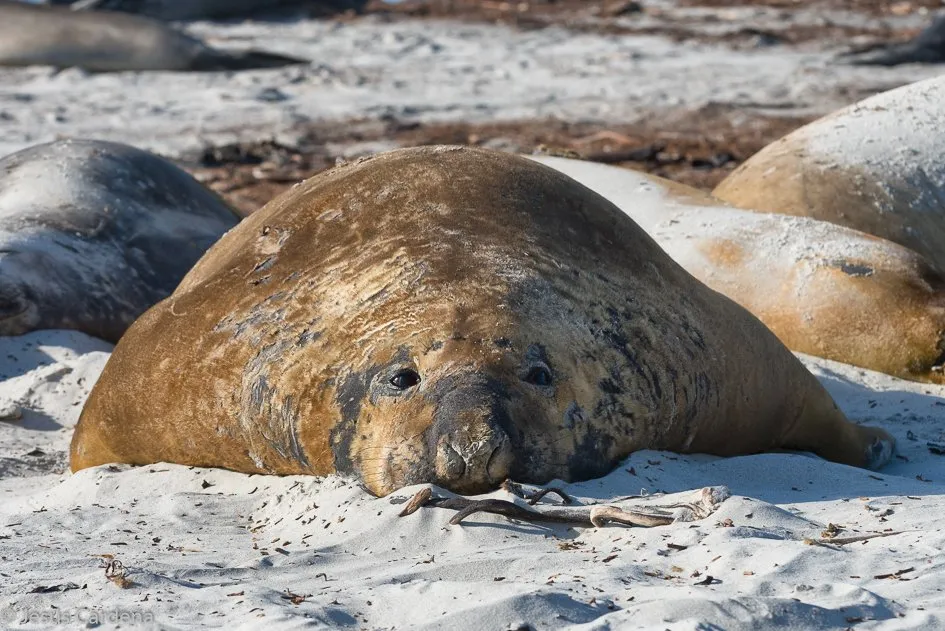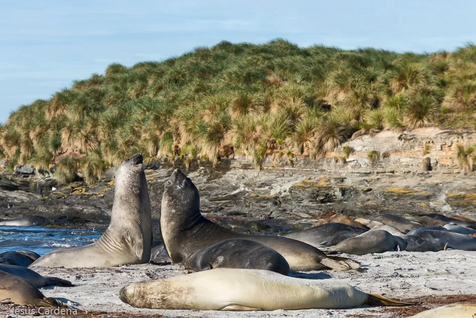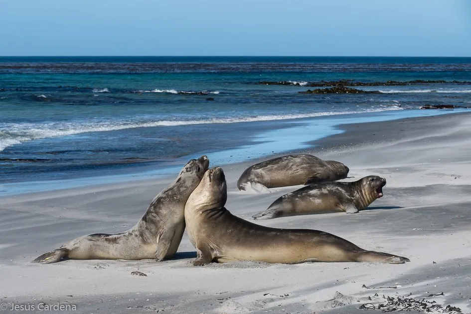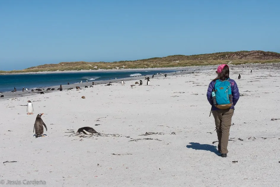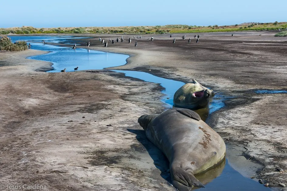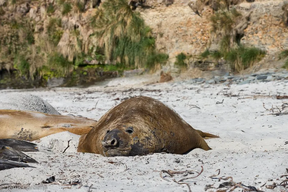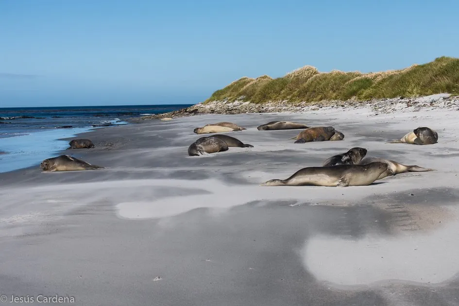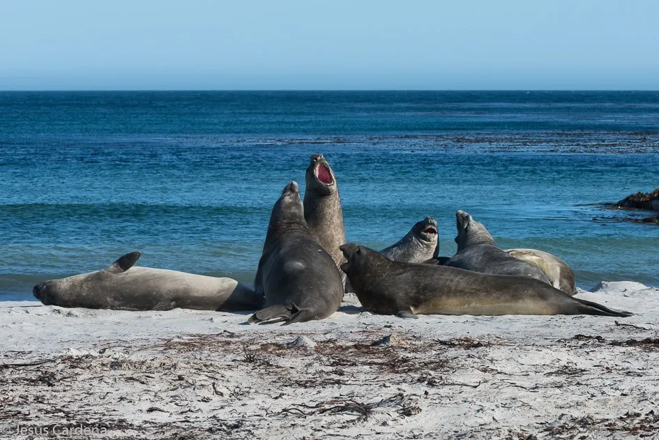 Comemos el lunch y salimos a pasear por la playa cercana al hotel. Hasta llegar a la playa están los Papúa subiendo y bajando a los nidos, también pingüinos Magallanes, y ya en la playa de arena blanca nos encontramos bastantes elefantes machos y hembras al sol. El extremo este de la playa termina en dunas las atravesamos para llegar a otra la playa al norte, en esta playa hay numerosos apostaderos para observar, seguimos andando por la playa entre pingüinos y nos encontramos con un pingüino Rey, solito tumbado en la arena, y muchos más elefantes, esta vez machos juntos entrenándose en la lucha, son más grandes que los que vimos en Argentina, y muchos, además no se asustan con facilidad y puedes pasar muy cerca de ellos. Agotamos el tiempo, es ya tarde para la cena así que acortamos por medio del campo, en realidad los caminos no están muy definidos y nos encontramos con una pareja de caracaras estriados, defendiendo su zona, no hacen más que volar por encima de nuestras cabezas dando aletazos para alejarlos, una de las veces uno le roba el gorro a Carmen, lo soltó a unos 50 m!.