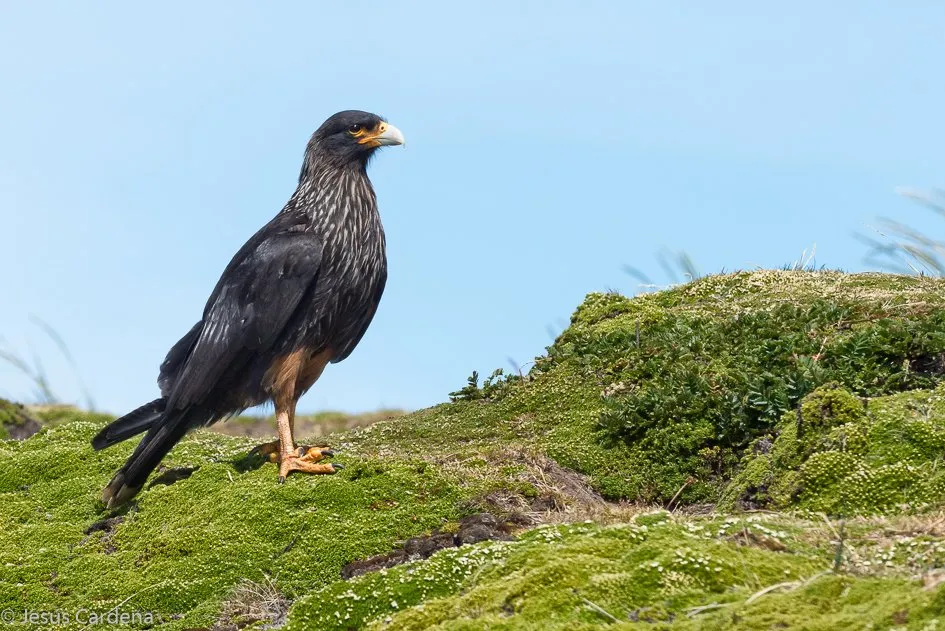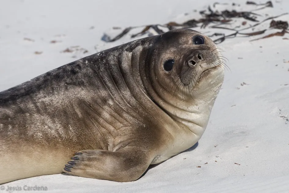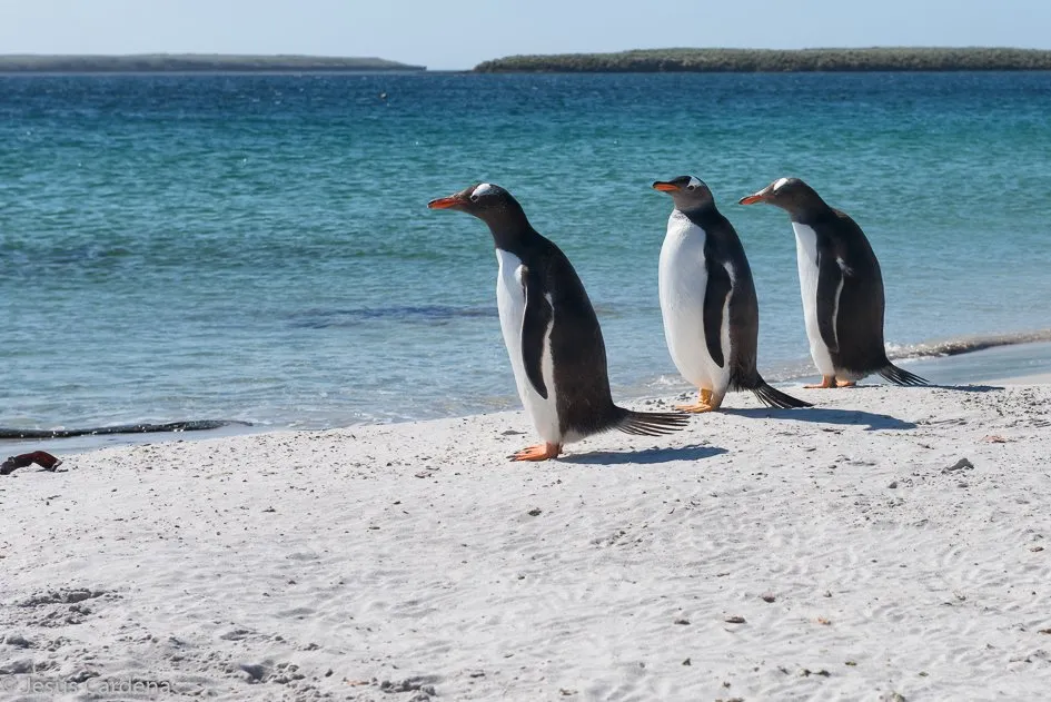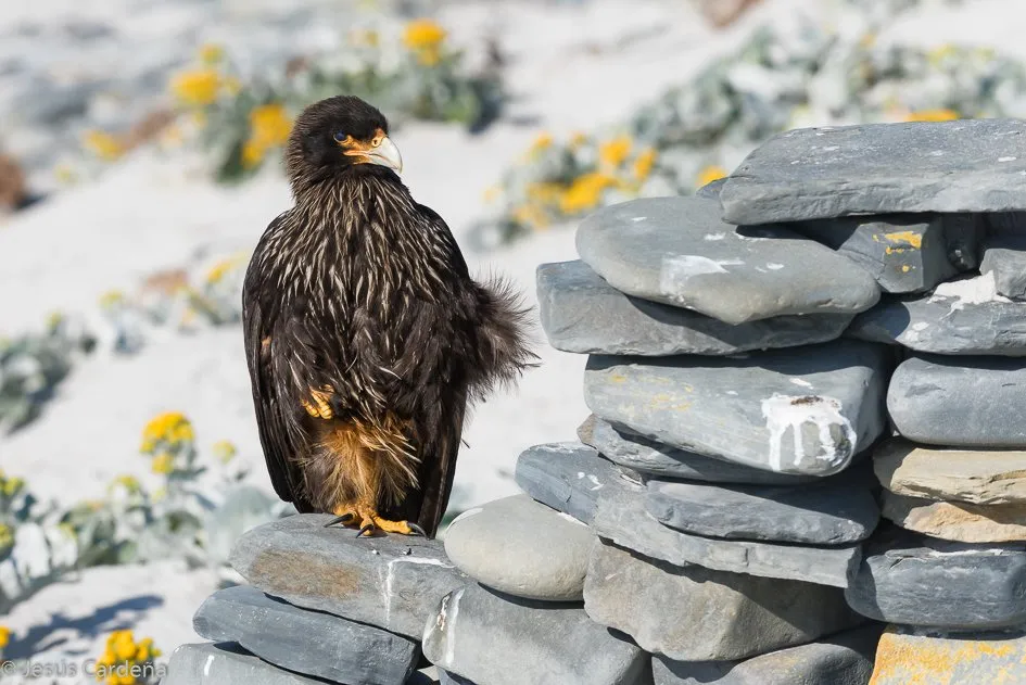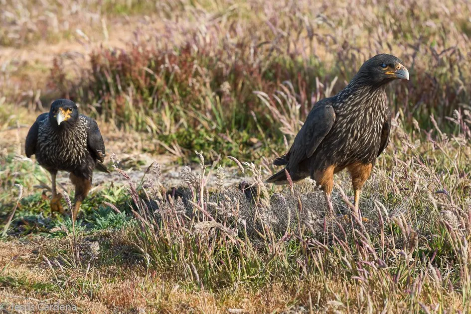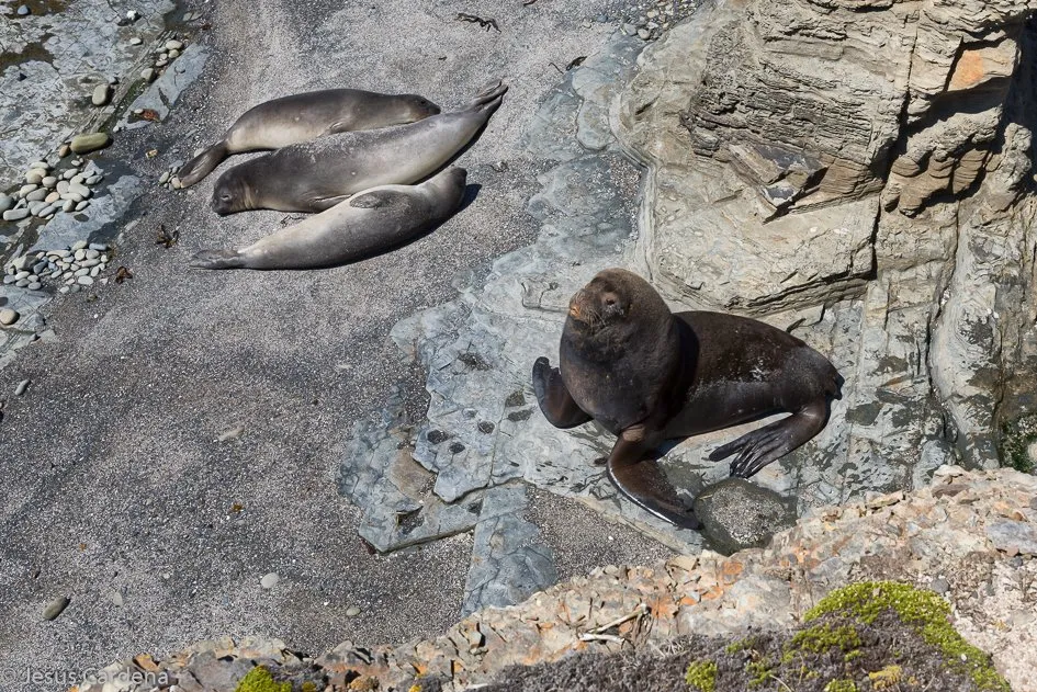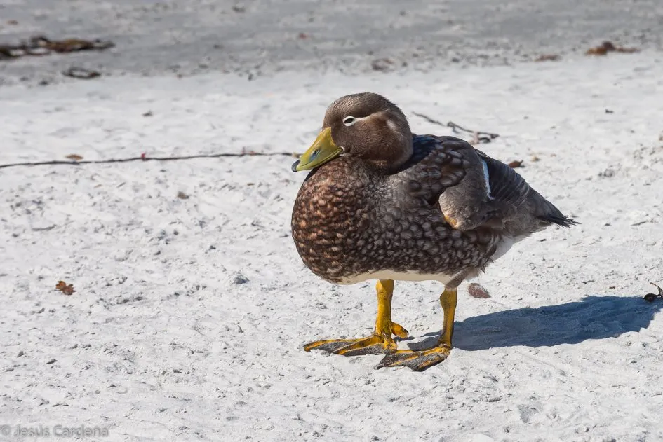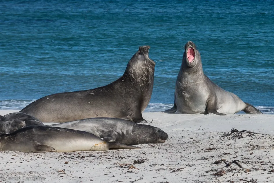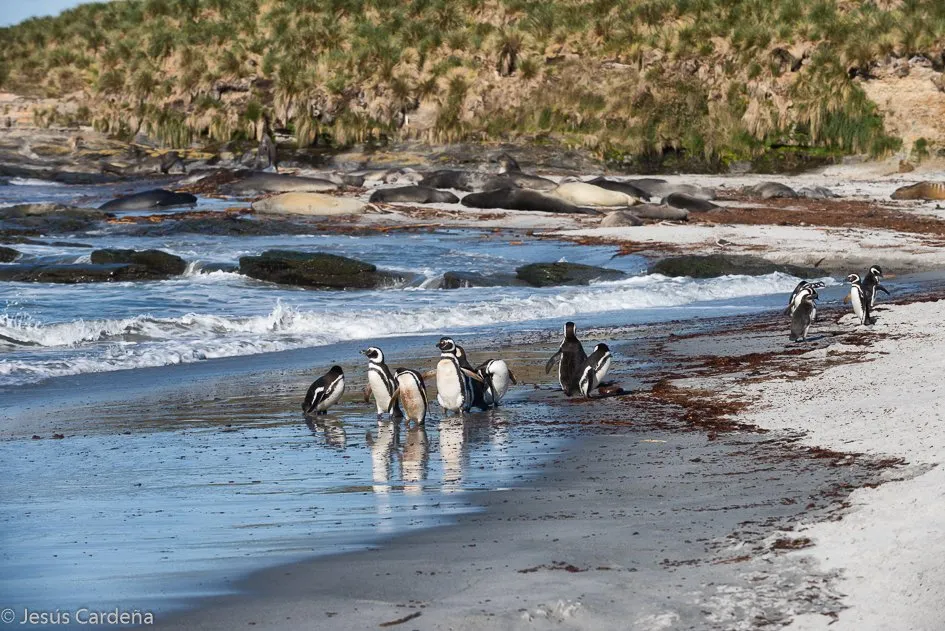 Comemos el lunch y salimos a pasear por la playa cercana al hotel. Hasta llegar a la playa están los Papúa subiendo y bajando a los nidos, también pingüinos Magallanes, y ya en la playa de arena blanca nos encontramos bastantes elefantes machos y hembras al sol. El extremo este de la playa termina en dunas las atravesamos para llegar a otra la playa al norte, en esta playa hay numerosos apostaderos para observar, seguimos andando por la playa entre pingüinos y nos encontramos con un pingüino Rey, solito tumbado en la arena, y muchos más elefantes, esta vez machos juntos entrenándose en la lucha, son más grandes que los que vimos en Argentina, y muchos, además no se asustan con facilidad y puedes pasar muy cerca de ellos. Agotamos el tiempo, es ya tarde para la cena así que acortamos por medio del campo, en realidad los caminos no están muy definidos y nos encontramos con una pareja de caracaras estriados, defendiendo su zona, no hacen más que volar por encima de nuestras cabezas dando aletazos para alejarlos, una de las veces uno le roba el gorro a Carmen, lo soltó a unos 50 m!.