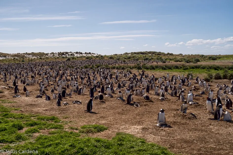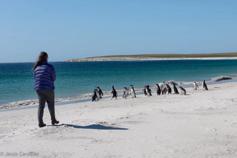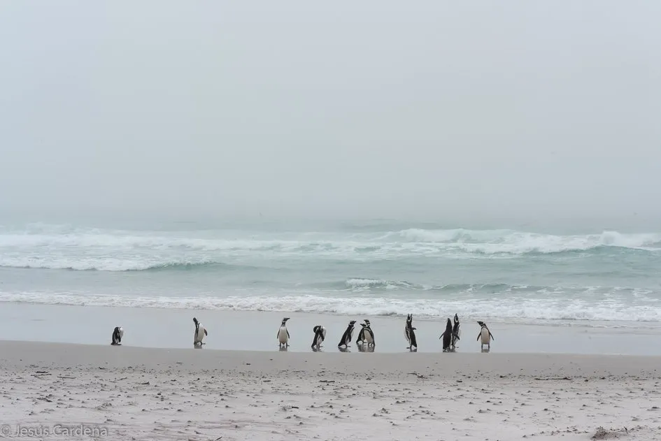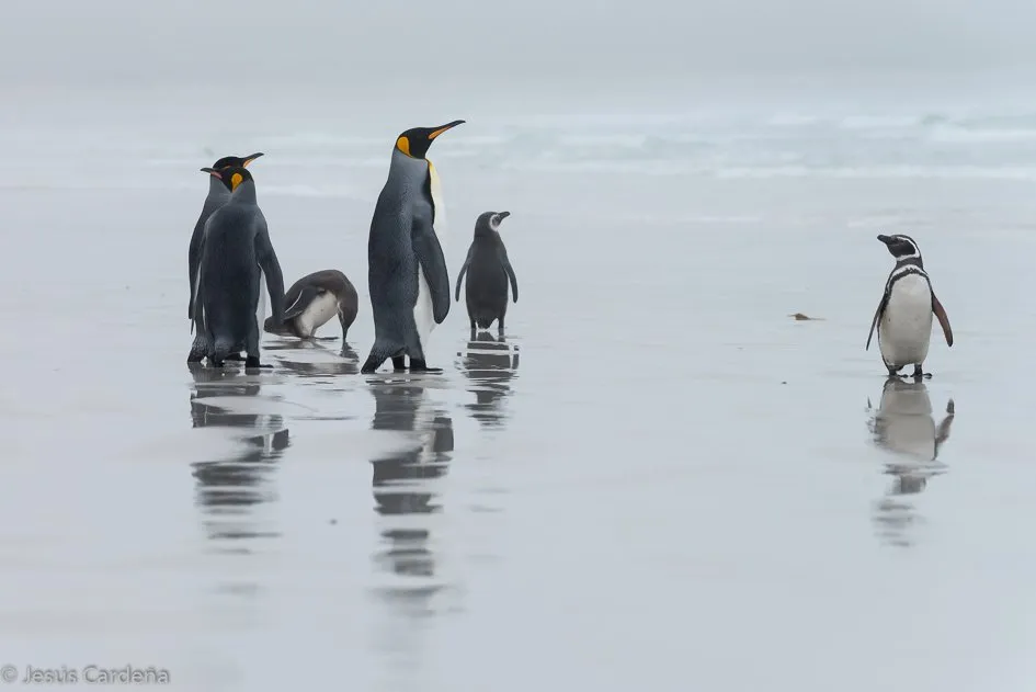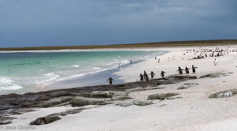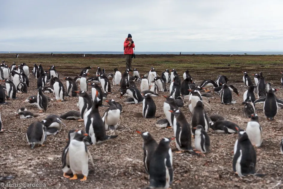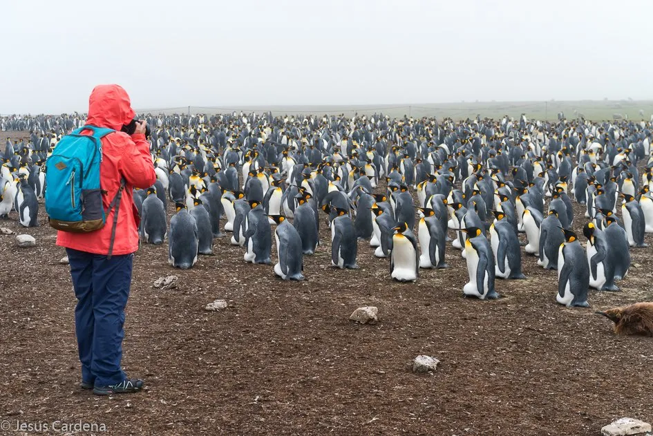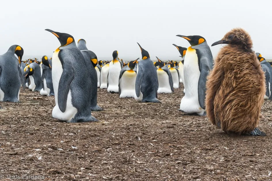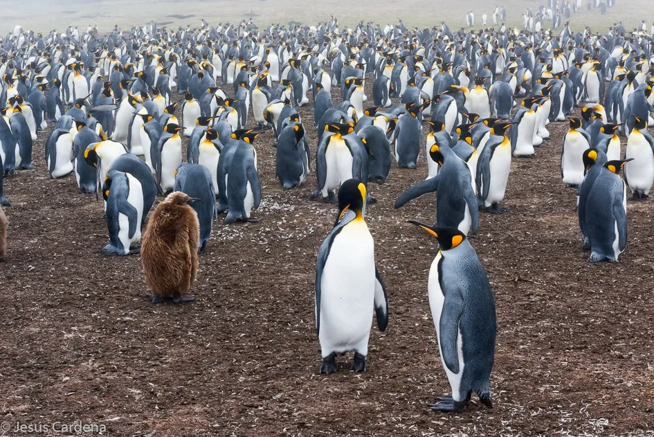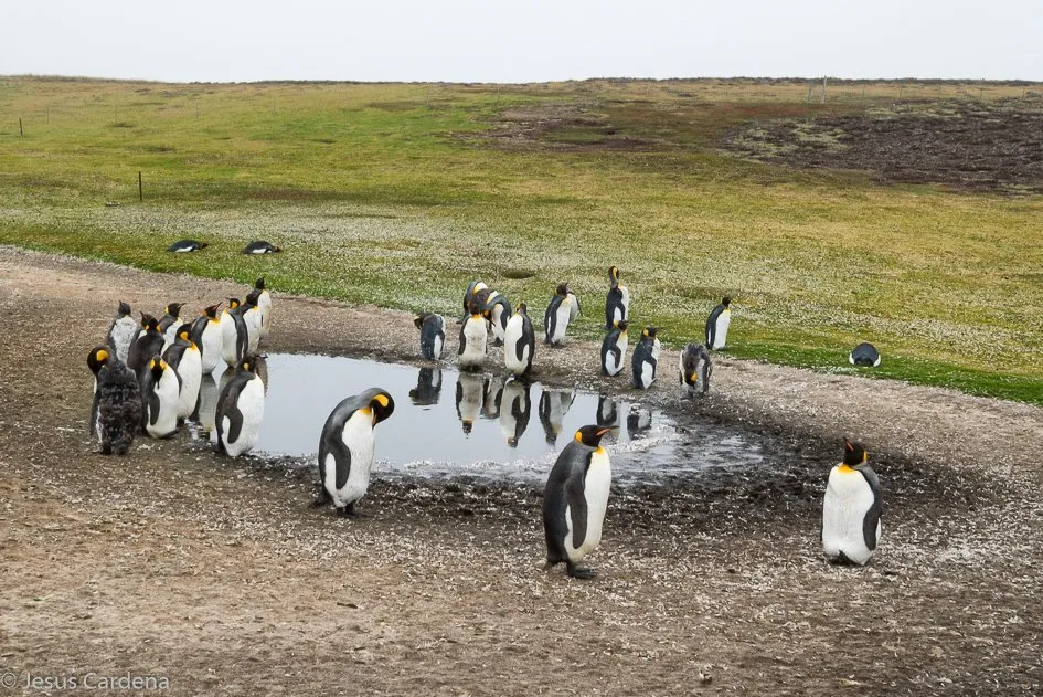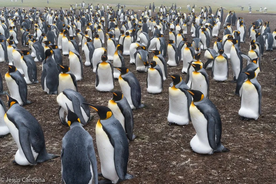 Hoy pronto nos van a buscar al hotel para ir a Volunteer Point, la pingüinera de los pingüinos Rey. Amanece día cubierto con niebla, nos acompañará todo el día. Llegar a la punta es todo un logro, está como a 2.30 h de Stanley, primero carretera, después ripio y por último más de una hora de 4×4, vamos en grupo por si algún coche se queda, es un terreno complicado lleno de turba y agujeros. Cuando llegamos a la punta casi no podemos percibir la playa de la niebla que hay. Del aparcamiento ya se ven dos o tres grupos grandes en círculo y muchos pingüinos al rededor, es una pasada, son grandes y andan como muy orgullosos, balanceándose, discuten entre ellos dándose aletazos y como son tan grandes las aletas suenan como tortas, plas, plas,. Su graznidos es como el de una trompeta. Hay algún polluelos con sus cuerpos cubierto de plumón fino y pardo que parece pelo. Estos llaman a sus padres y suena como un silbato. Al fondo de la colonia hay algunos bañándose en el mar, en el agua parecen patos. Al otro lado esta la playa, muy bonita de tierra blanca, en esta podemos ver más tipo de pingüinos, Papúa, Magallanes, etc.