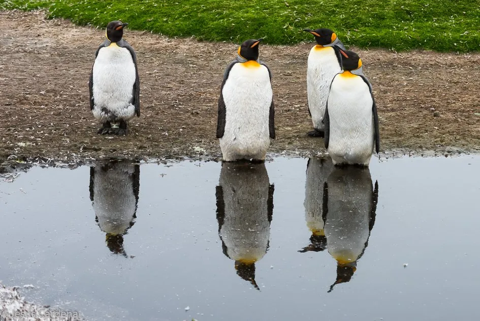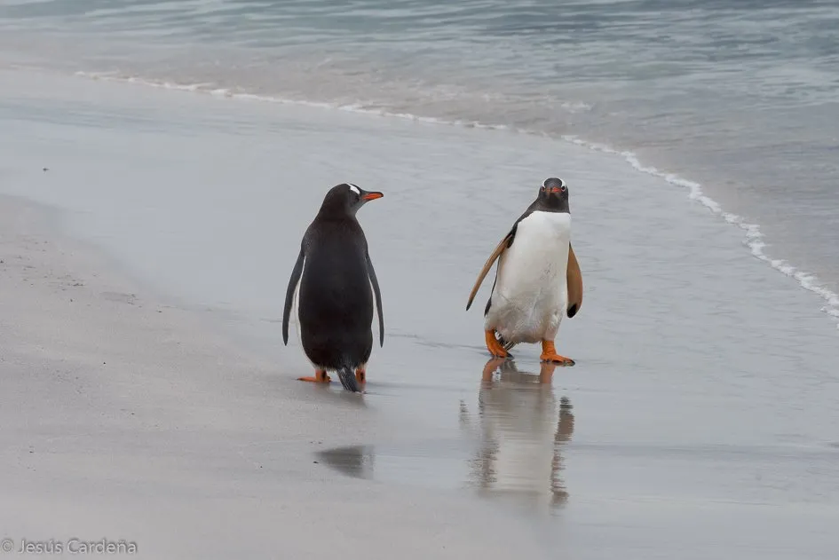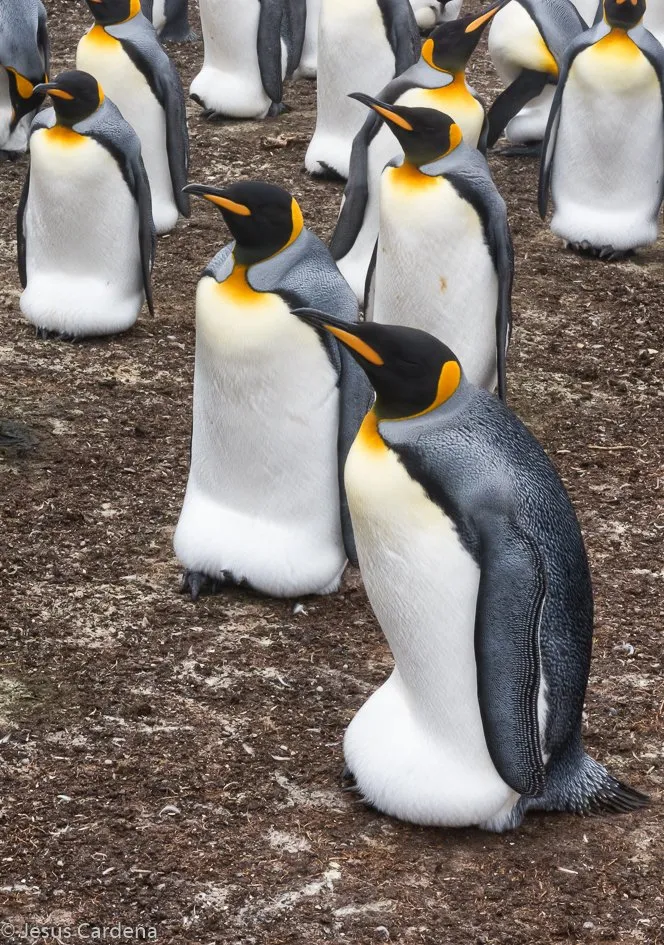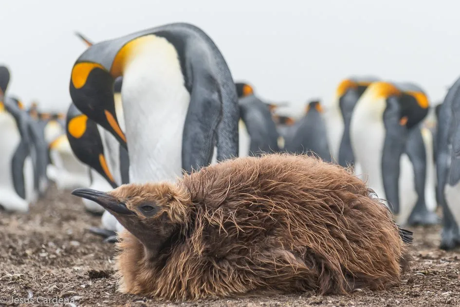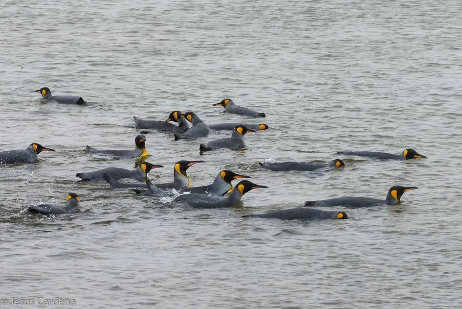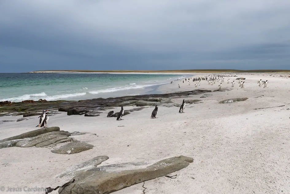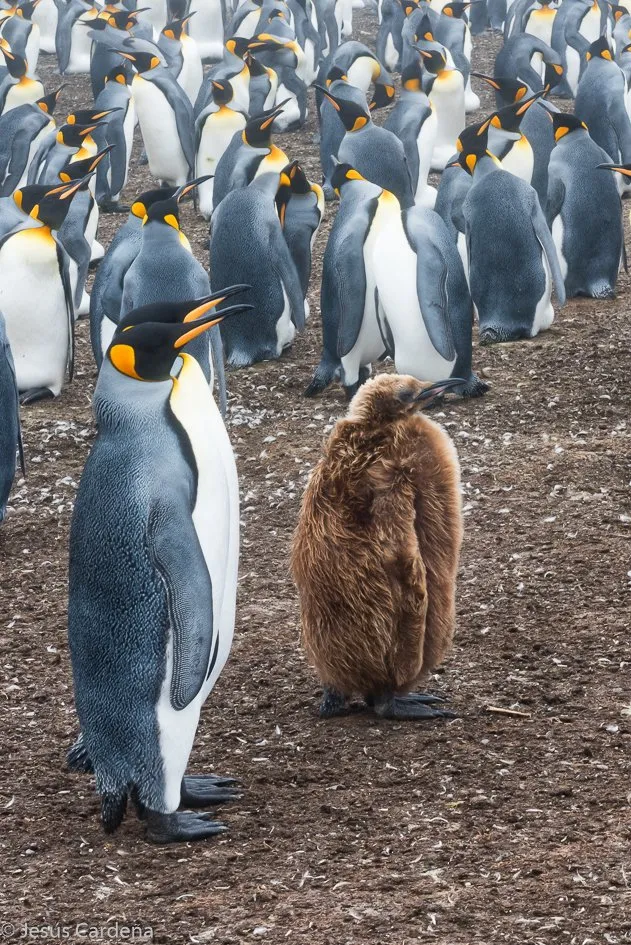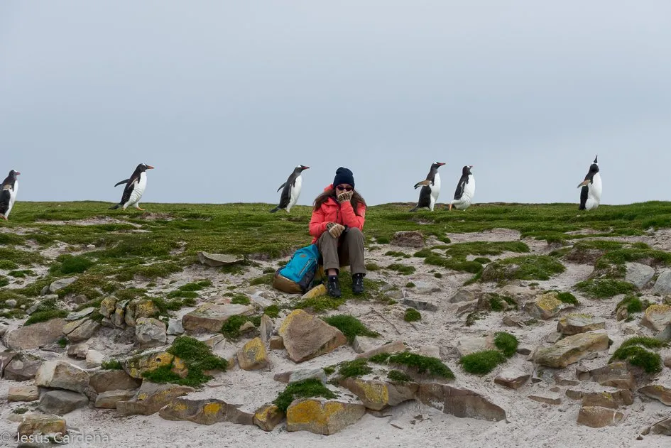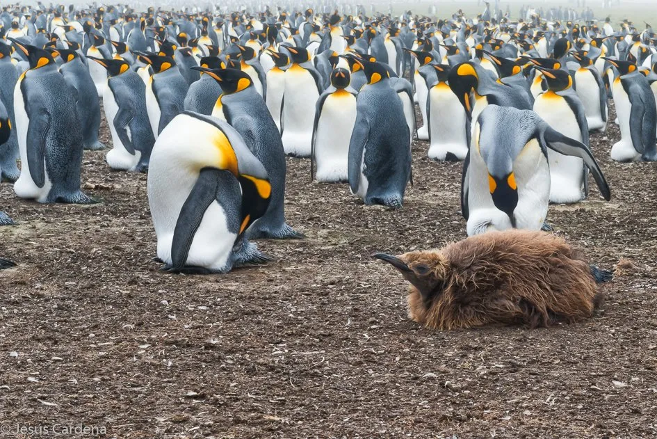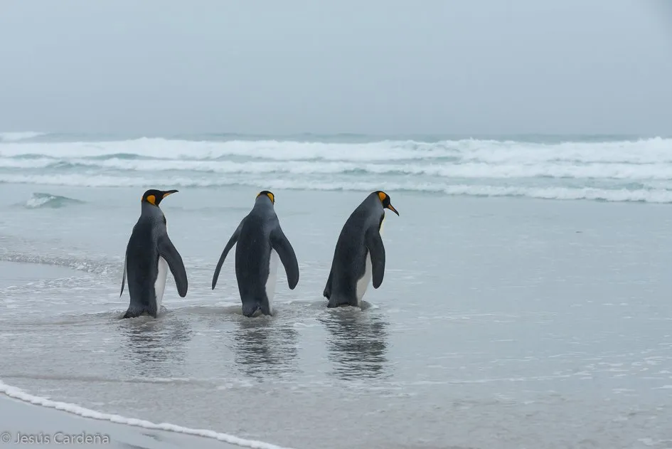 Hoy pronto nos van a buscar al hotel para ir a Volunteer Point, la pingüinera de los pingüinos Rey. Amanece día cubierto con niebla, nos acompañará todo el día. Llegar a la punta es todo un logro, está como a 2.30 h de Stanley, primero carretera, después ripio y por último más de una hora de 4×4, vamos en grupo por si algún coche se queda, es un terreno complicado lleno de turba y agujeros. Cuando llegamos a la punta casi no podemos percibir la playa de la niebla que hay. Del aparcamiento ya se ven dos o tres grupos grandes en círculo y muchos pingüinos al rededor, es una pasada, son grandes y andan como muy orgullosos, balanceándose, discuten entre ellos dándose aletazos y como son tan grandes las aletas suenan como tortas, plas, plas,. Su graznidos es como el de una trompeta. Hay algún polluelos con sus cuerpos cubierto de plumón fino y pardo que parece pelo. Estos llaman a sus padres y suena como un silbato. Al fondo de la colonia hay algunos bañándose en el mar, en el agua parecen patos. Al otro lado esta la playa, muy bonita de tierra blanca, en esta podemos ver más tipo de pingüinos, Papúa, Magallanes, etc.