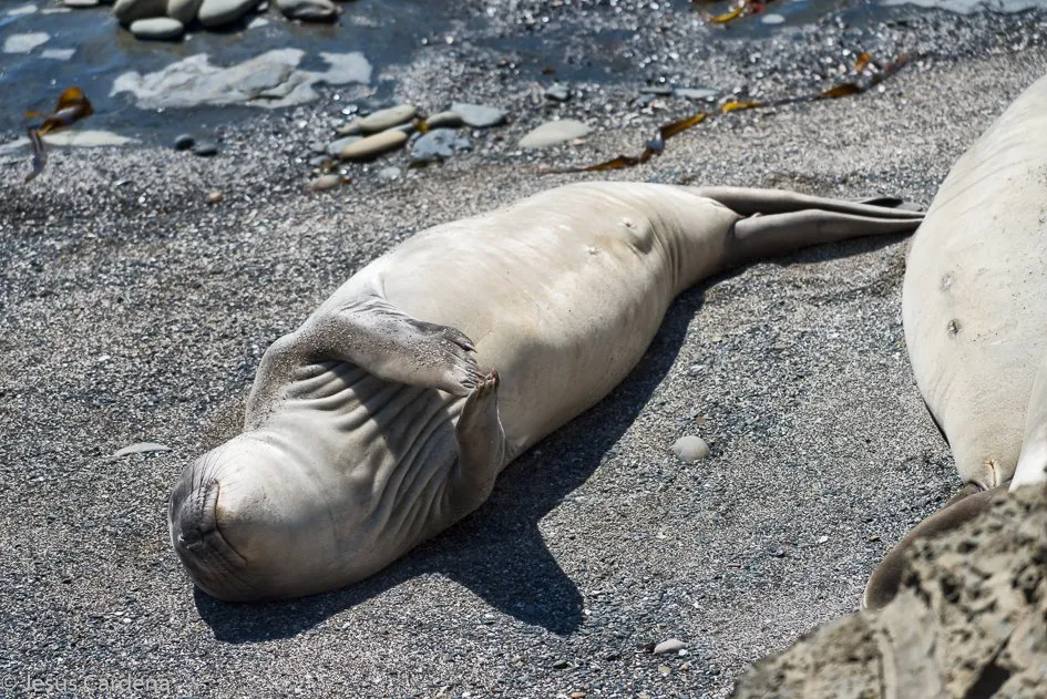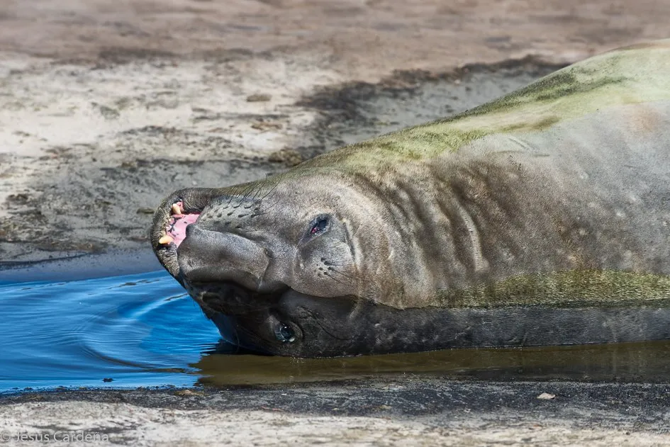 Nos levantamos muy pronto para ir sin desayuno a la playa de los elefantes marinos, están bastante activos en la mañana practicando la lucha, son verdaderamente tremendos!, Hay muchos pingüinos entrando y saliendo del agua. Volvemos a ver el Pingüino Rey, esta vez junto con otros en la playa. Volvemos a desayunar y nos vamos de nuevo a ver los leones marinos, de vuelta Jesús se queda leyendo en el hotel y Carmen vuelve a la playa que todavía no hemos ido, hace muy buena tarde