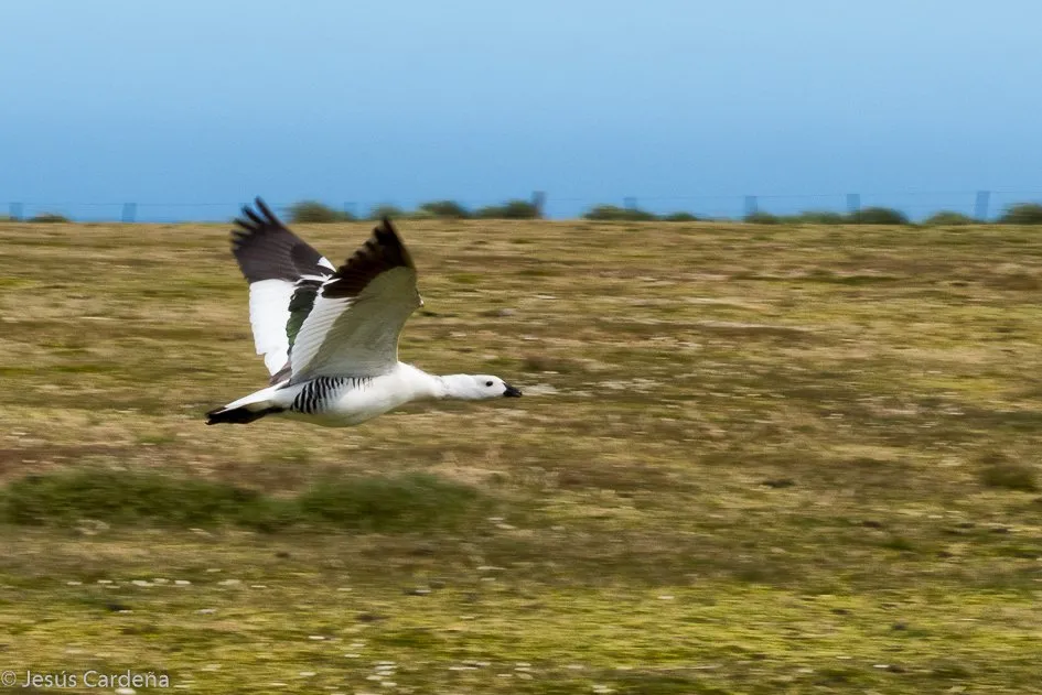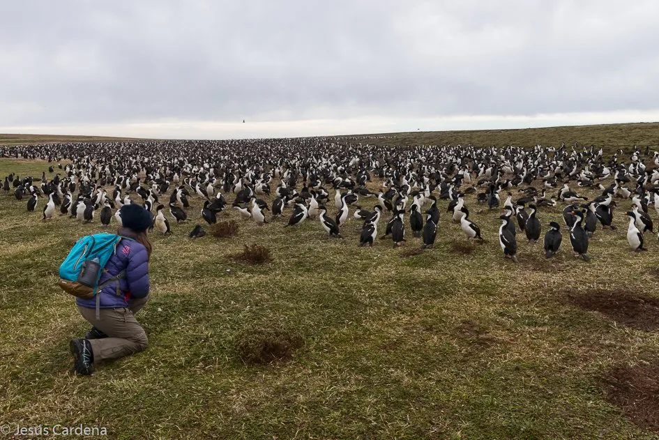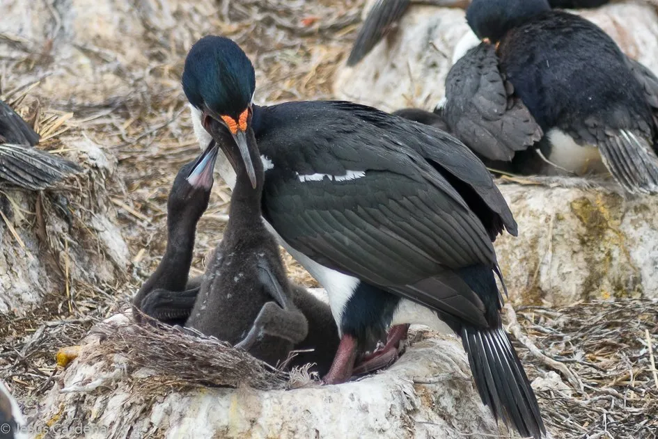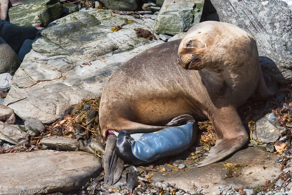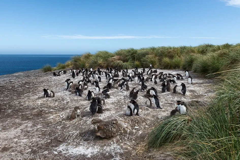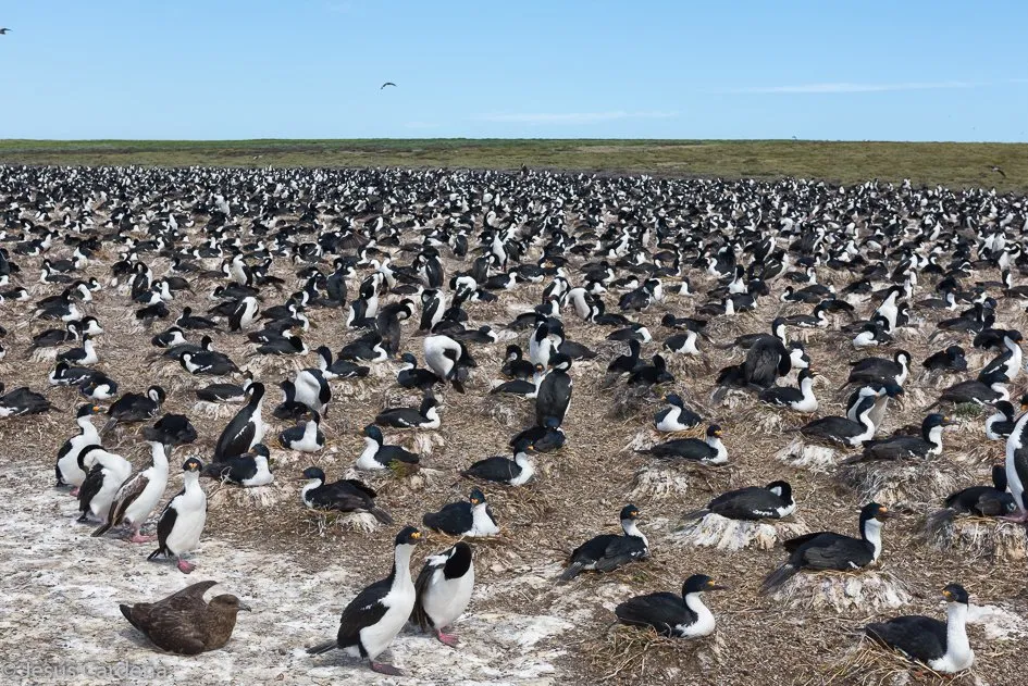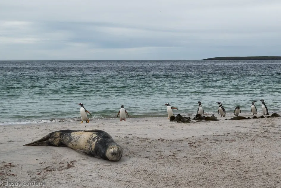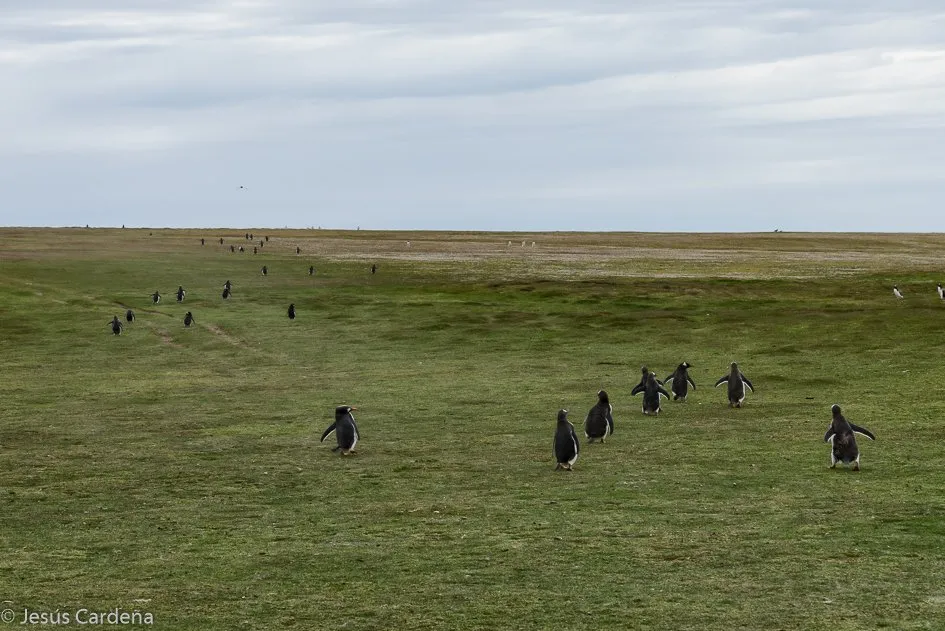 Cuando llegamos nos esperan los dueños en su todo terreno y nos llevan primero a la playa, tenemos que esperar otro avión, así que hacemos tiempo allí. La playa es de arena blanca, el agua del mar es turquesa y con el día soleado parece que estamos en el Caribe, sino fuera porque estamos rodeados de pingüinos por todas partes, aquí el Papúa y Magallanes están por toda la playa desperdigados, saliendo y entrando del agua, parecen torpedos al llegar nadando super deprisa. En una hora nos vienen a buscar y nos enseñan de camino a la casa, dónde podemos encontrar las colonias de los penachos amarillo, “rockhopper”, como los llaman ellos. Llegamos a la estancia, tienen dos casas, la principal con varias habitaciones y donde esta la cocina y el comedor, la otra con solo dos habitaciones con un salón enorme, cocina y una sala acristalada con muy buenas vistas. Tenemos la suerte de que nos instalan en esta última sin que la otra habitación esté ocupada. Tras llegar y dejadas las maletas nos llevan a ver la zona de los leones marinos. Desde un pequeño acantilado puedes ver los leones desde arriba, sentados. No hay muchos pero realmente están muy cerca, nos quedamos allí un buen rato, hace calor y se está muy bien. Nos damos un susto porque de repente aparece una pareja de Lobos Marinos muy cerca de nosotros, entre los matorrales, nos levantamos y nos alejamos de ellos, están buscando un rinconcito dende aparearse sin que otros machos les molesten. Volvemos y tenemos preparado el boxlunch, así que comemos y después saldremos a ver los pingüinos de penacho amarillo. Están en unas rocas, en un acantilado a unos 1,5 km, hay muchos y tienen las crias ya muy grandes. Este pingüino resulta ser el que menos se asusta y a la vez el más escandaloso y agresivo entre ellos, están constantemente graznando y picoteándose con fuerza, tenemos la suerte de ver un pingüino Macaroni o de ceja amarilla entre ellos, uno solo, uno solo pero allí estaba. Tras un buen rato contemplando y disfrutando de estos pingüinos volver a la casa pero nos entretenemos con una colonia de cormoranes imperiales que hay a tan solo 300 de las casa. No me había fijado bien pero el pingüino y el cormorán se parece mucho, incluso se mezclan en las pingüineras. Este cormorán hace los nidos en tierra y se pasa el día arreglando su nido con ramas y algas, tienen también pollitos pero de muy distinto tamaño y también tienen incordiando a los scubas a su alrededor, tratando de hacerse con algún pollito al descuido de los padres.