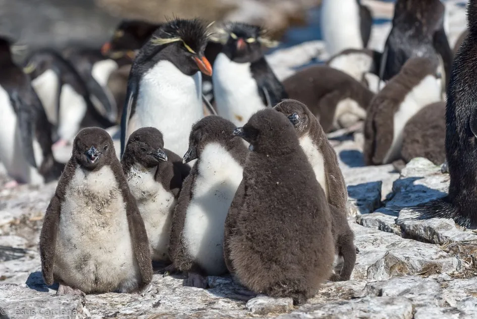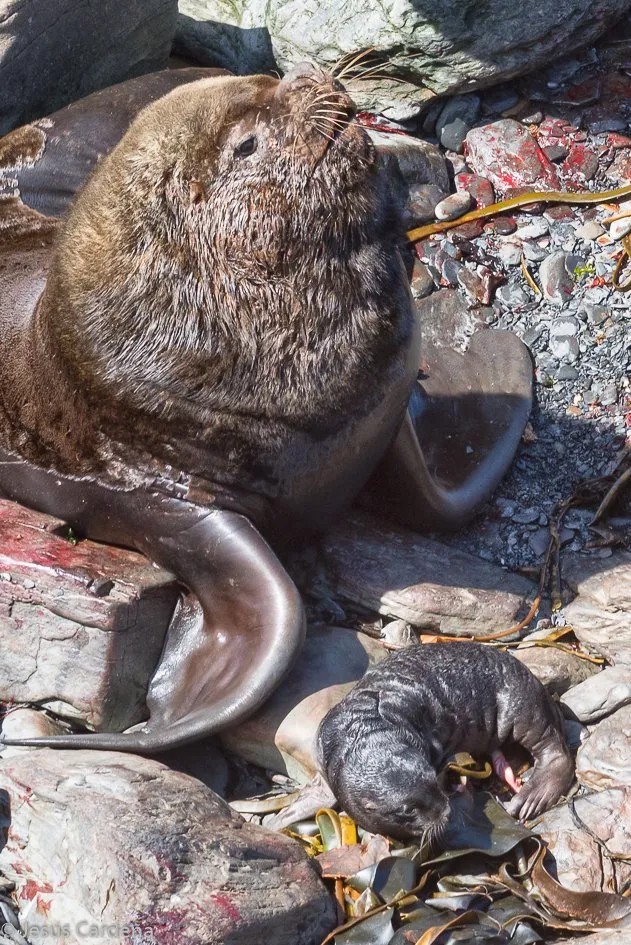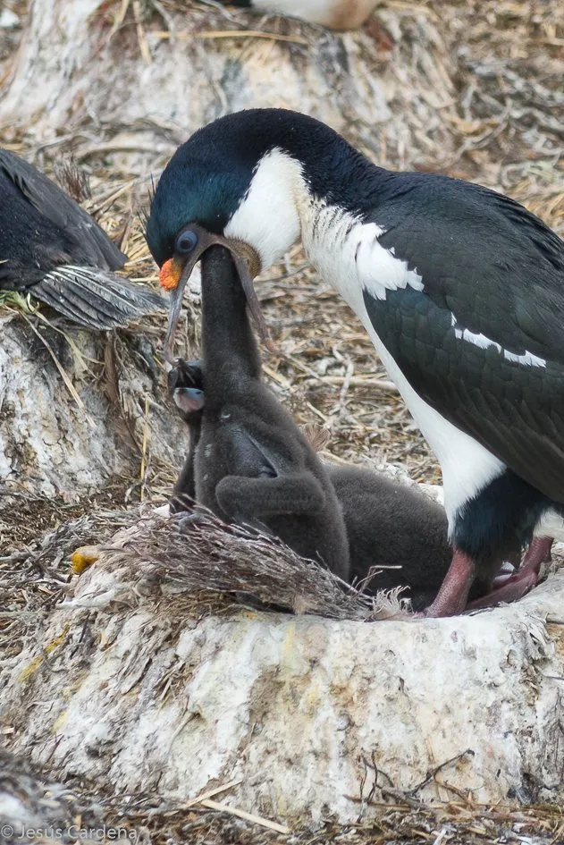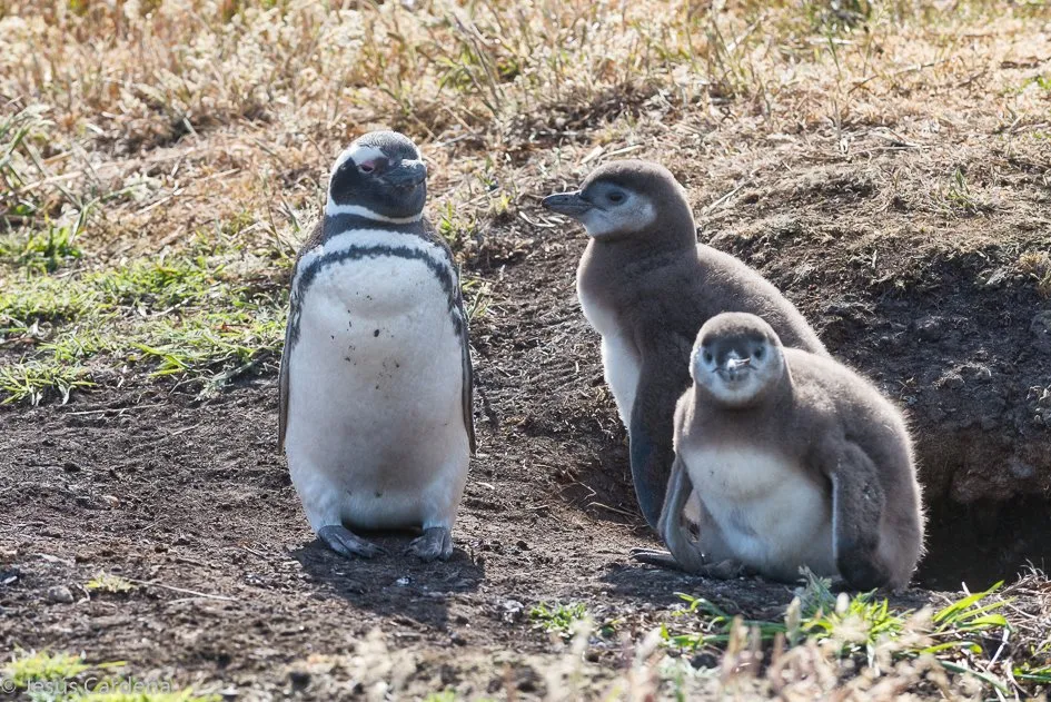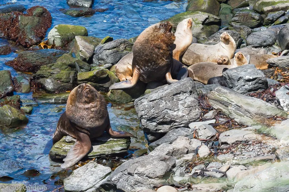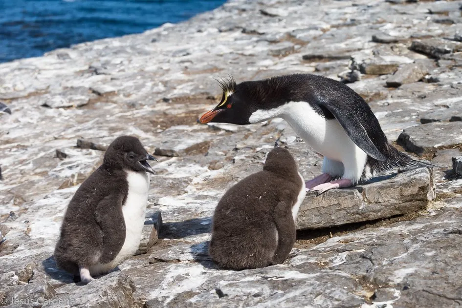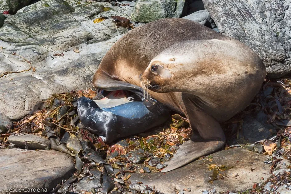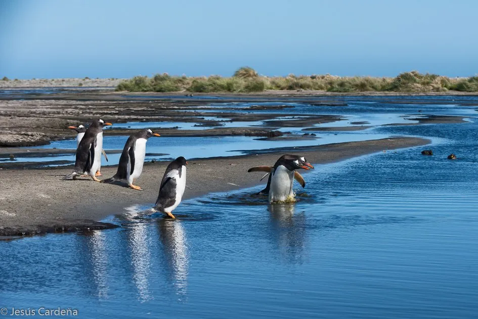 Cuando llegamos nos esperan los dueños en su todo terreno y nos llevan primero a la playa, tenemos que esperar otro avión, así que hacemos tiempo allí. La playa es de arena blanca, el agua del mar es turquesa y con el día soleado parece que estamos en el Caribe, sino fuera porque estamos rodeados de pingüinos por todas partes, aquí el Papúa y Magallanes están por toda la playa desperdigados, saliendo y entrando del agua, parecen torpedos al llegar nadando super deprisa. En una hora nos vienen a buscar y nos enseñan de camino a la casa, dónde podemos encontrar las colonias de los penachos amarillo, “rockhopper”, como los llaman ellos. Llegamos a la estancia, tienen dos casas, la principal con varias habitaciones y donde esta la cocina y el comedor, la otra con solo dos habitaciones con un salón enorme, cocina y una sala acristalada con muy buenas vistas. Tenemos la suerte de que nos instalan en esta última sin que la otra habitación esté ocupada. Tras llegar y dejadas las maletas nos llevan a ver la zona de los leones marinos. Desde un pequeño acantilado puedes ver los leones desde arriba, sentados. No hay muchos pero realmente están muy cerca, nos quedamos allí un buen rato, hace calor y se está muy bien. Nos damos un susto porque de repente aparece una pareja de Lobos Marinos muy cerca de nosotros, entre los matorrales, nos levantamos y nos alejamos de ellos, están buscando un rinconcito dende aparearse sin que otros machos les molesten. Volvemos y tenemos preparado el boxlunch, así que comemos y después saldremos a ver los pingüinos de penacho amarillo. Están en unas rocas, en un acantilado a unos 1,5 km, hay muchos y tienen las crias ya muy grandes. Este pingüino resulta ser el que menos se asusta y a la vez el más escandaloso y agresivo entre ellos, están constantemente graznando y picoteándose con fuerza, tenemos la suerte de ver un pingüino Macaroni o de ceja amarilla entre ellos, uno solo, uno solo pero allí estaba. Tras un buen rato contemplando y disfrutando de estos pingüinos volver a la casa pero nos entretenemos con una colonia de cormoranes imperiales que hay a tan solo 300 de las casa. No me había fijado bien pero el pingüino y el cormorán se parece mucho, incluso se mezclan en las pingüineras. Este cormorán hace los nidos en tierra y se pasa el día arreglando su nido con ramas y algas, tienen también pollitos pero de muy distinto tamaño y también tienen incordiando a los scubas a su alrededor, tratando de hacerse con algún pollito al descuido de los padres.