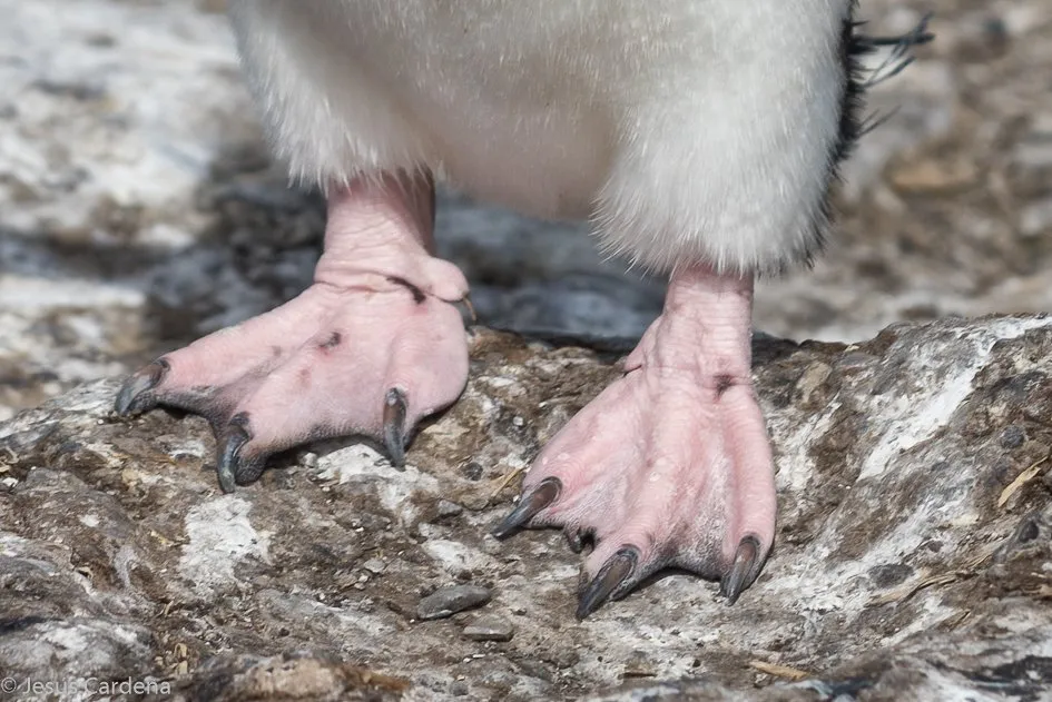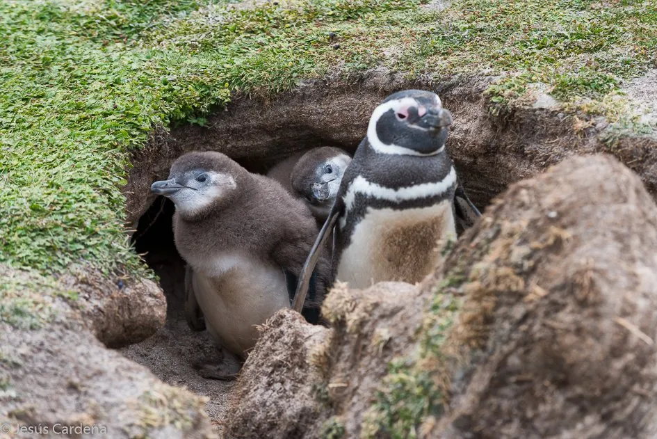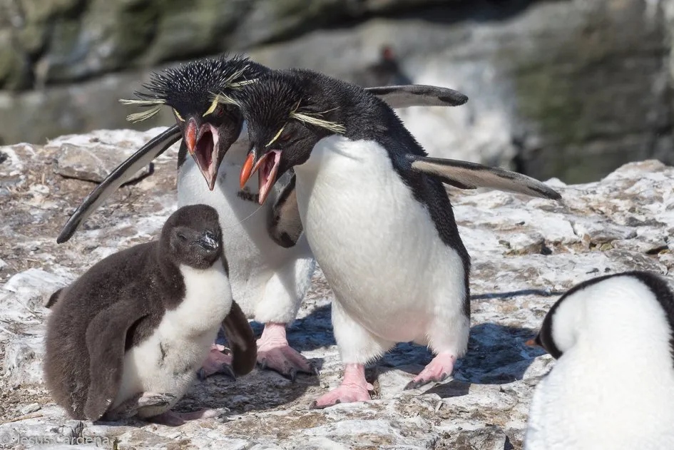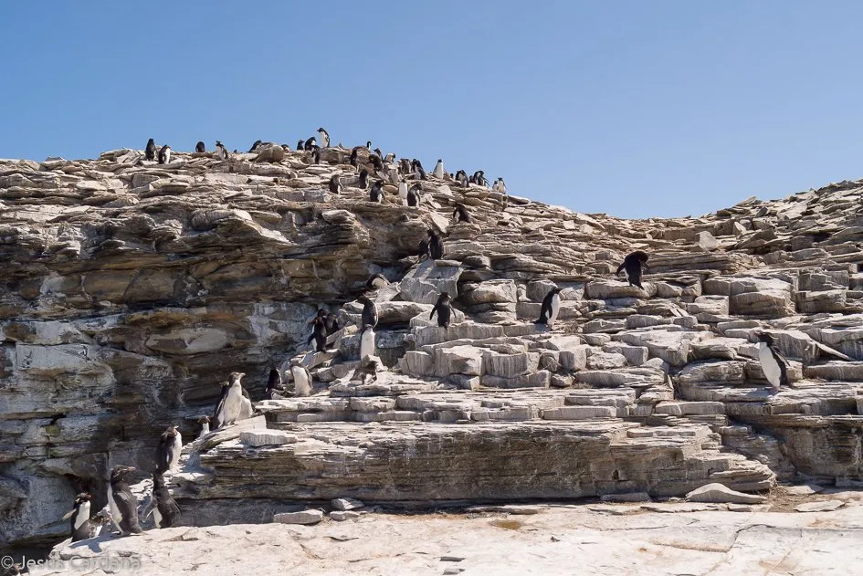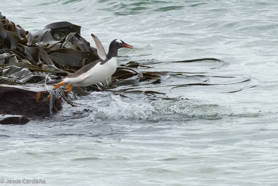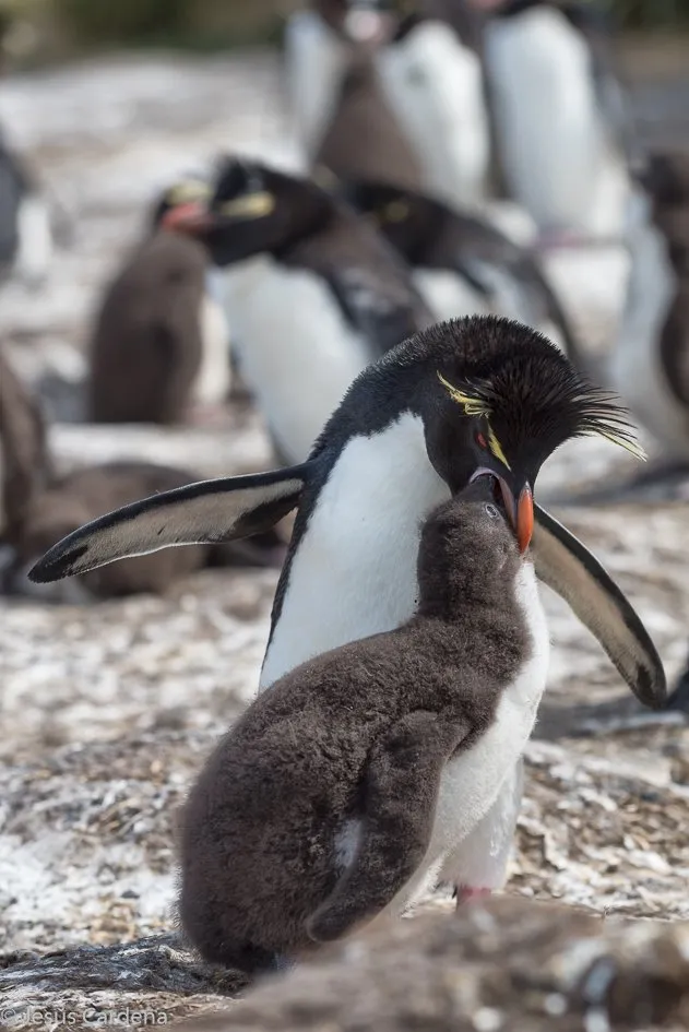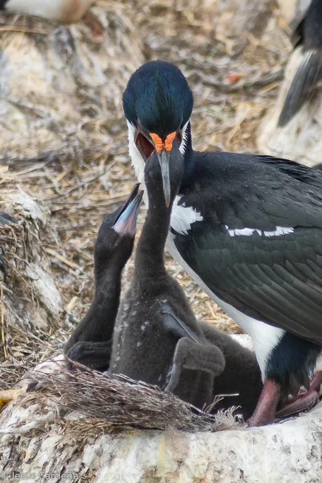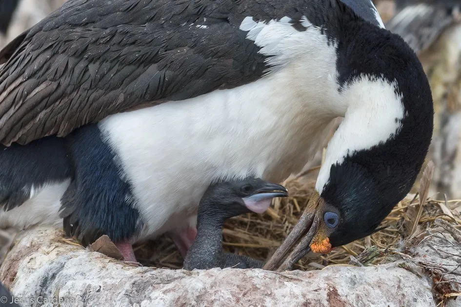 Cuando llegamos nos esperan los dueños en su todo terreno y nos llevan primero a la playa, tenemos que esperar otro avión, así que hacemos tiempo allí. La playa es de arena blanca, el agua del mar es turquesa y con el día soleado parece que estamos en el Caribe, sino fuera porque estamos rodeados de pingüinos por todas partes, aquí el Papúa y Magallanes están por toda la playa desperdigados, saliendo y entrando del agua, parecen torpedos al llegar nadando super deprisa. En una hora nos vienen a buscar y nos enseñan de camino a la casa, dónde podemos encontrar las colonias de los penachos amarillo, “rockhopper”, como los llaman ellos. Llegamos a la estancia, tienen dos casas, la principal con varias habitaciones y donde esta la cocina y el comedor, la otra con solo dos habitaciones con un salón enorme, cocina y una sala acristalada con muy buenas vistas. Tenemos la suerte de que nos instalan en esta última sin que la otra habitación esté ocupada. Tras llegar y dejadas las maletas nos llevan a ver la zona de los leones marinos. Desde un pequeño acantilado puedes ver los leones desde arriba, sentados. No hay muchos pero realmente están muy cerca, nos quedamos allí un buen rato, hace calor y se está muy bien. Nos damos un susto porque de repente aparece una pareja de Lobos Marinos muy cerca de nosotros, entre los matorrales, nos levantamos y nos alejamos de ellos, están buscando un rinconcito dende aparearse sin que otros machos les molesten. Volvemos y tenemos preparado el boxlunch, así que comemos y después saldremos a ver los pingüinos de penacho amarillo. Están en unas rocas, en un acantilado a unos 1,5 km, hay muchos y tienen las crias ya muy grandes. Este pingüino resulta ser el que menos se asusta y a la vez el más escandaloso y agresivo entre ellos, están constantemente graznando y picoteándose con fuerza, tenemos la suerte de ver un pingüino Macaroni o de ceja amarilla entre ellos, uno solo, uno solo pero allí estaba. Tras un buen rato contemplando y disfrutando de estos pingüinos volver a la casa pero nos entretenemos con una colonia de cormoranes imperiales que hay a tan solo 300 de las casa. No me había fijado bien pero el pingüino y el cormorán se parece mucho, incluso se mezclan en las pingüineras. Este cormorán hace los nidos en tierra y se pasa el día arreglando su nido con ramas y algas, tienen también pollitos pero de muy distinto tamaño y también tienen incordiando a los scubas a su alrededor, tratando de hacerse con algún pollito al descuido de los padres.