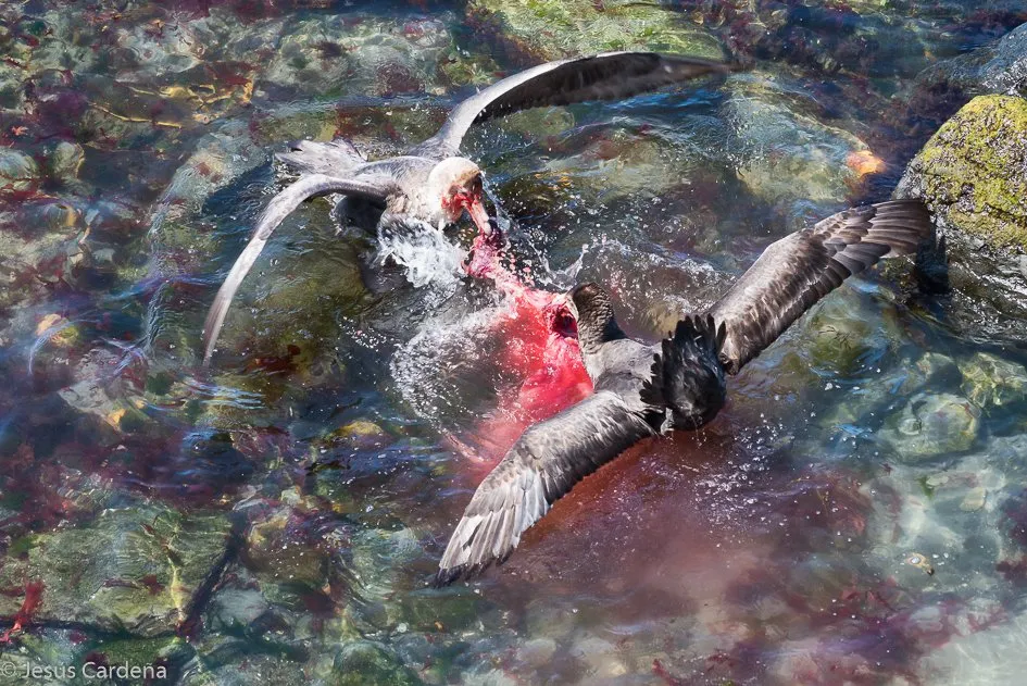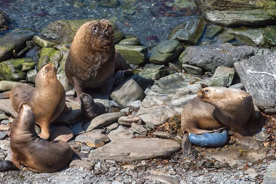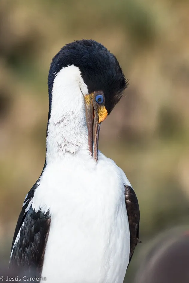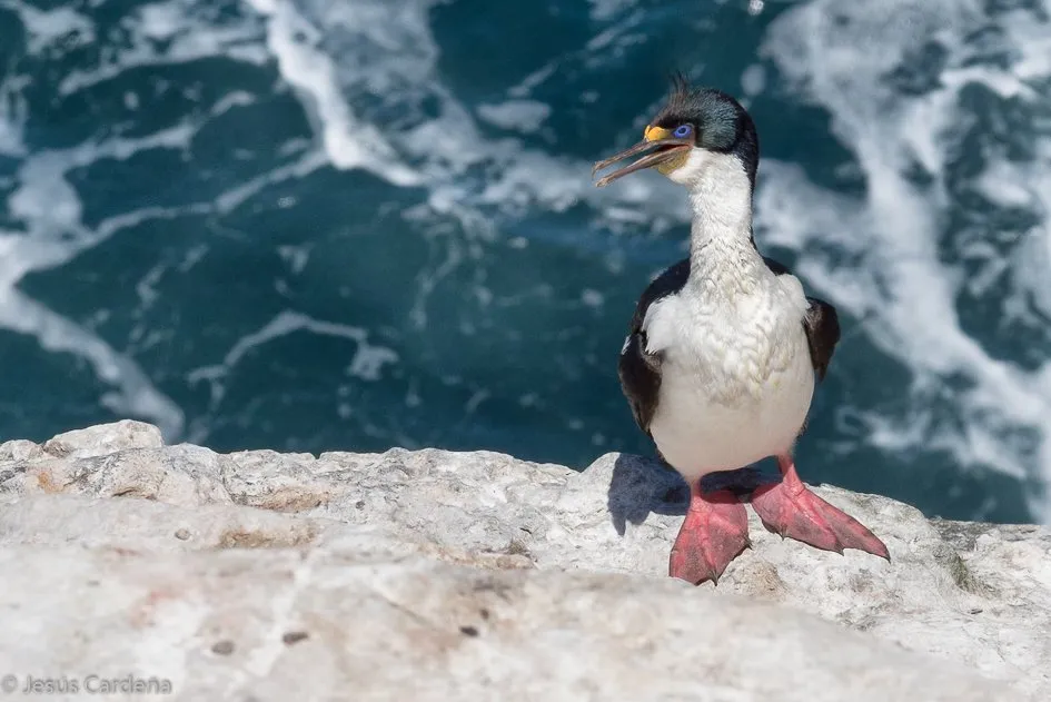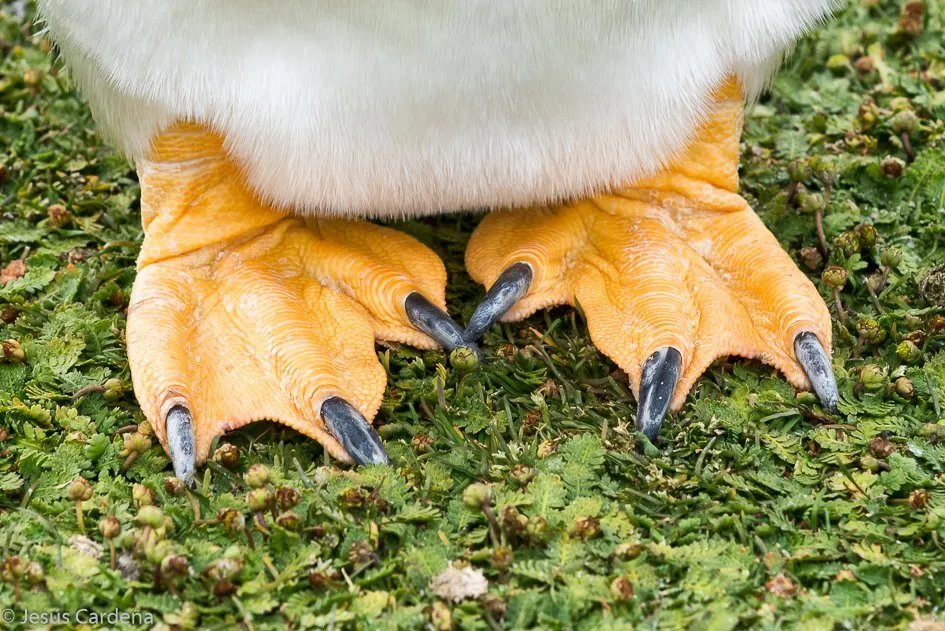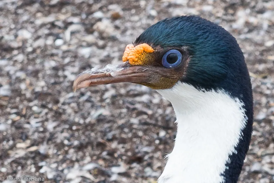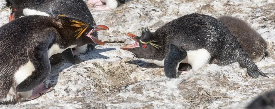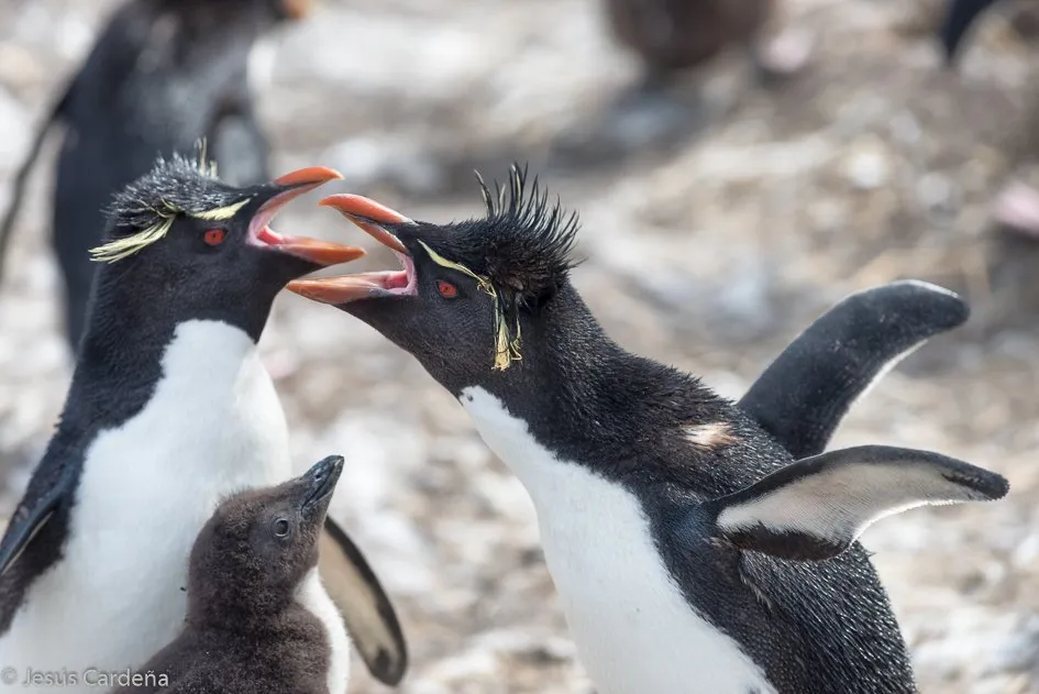 Cuando llegamos nos esperan los dueños en su todo terreno y nos llevan primero a la playa, tenemos que esperar otro avión, así que hacemos tiempo allí. La playa es de arena blanca, el agua del mar es turquesa y con el día soleado parece que estamos en el Caribe, sino fuera porque estamos rodeados de pingüinos por todas partes, aquí el Papúa y Magallanes están por toda la playa desperdigados, saliendo y entrando del agua, parecen torpedos al llegar nadando super deprisa. En una hora nos vienen a buscar y nos enseñan de camino a la casa, dónde podemos encontrar las colonias de los penachos amarillo, “rockhopper”, como los llaman ellos. Llegamos a la estancia, tienen dos casas, la principal con varias habitaciones y donde esta la cocina y el comedor, la otra con solo dos habitaciones con un salón enorme, cocina y una sala acristalada con muy buenas vistas. Tenemos la suerte de que nos instalan en esta última sin que la otra habitación esté ocupada. Tras llegar y dejadas las maletas nos llevan a ver la zona de los leones marinos. Desde un pequeño acantilado puedes ver los leones desde arriba, sentados. No hay muchos pero realmente están muy cerca, nos quedamos allí un buen rato, hace calor y se está muy bien. Nos damos un susto porque de repente aparece una pareja de Lobos Marinos muy cerca de nosotros, entre los matorrales, nos levantamos y nos alejamos de ellos, están buscando un rinconcito dende aparearse sin que otros machos les molesten. Volvemos y tenemos preparado el boxlunch, así que comemos y después saldremos a ver los pingüinos de penacho amarillo. Están en unas rocas, en un acantilado a unos 1,5 km, hay muchos y tienen las crias ya muy grandes. Este pingüino resulta ser el que menos se asusta y a la vez el más escandaloso y agresivo entre ellos, están constantemente graznando y picoteándose con fuerza, tenemos la suerte de ver un pingüino Macaroni o de ceja amarilla entre ellos, uno solo, uno solo pero allí estaba. Tras un buen rato contemplando y disfrutando de estos pingüinos volver a la casa pero nos entretenemos con una colonia de cormoranes imperiales que hay a tan solo 300 de las casa. No me había fijado bien pero el pingüino y el cormorán se parece mucho, incluso se mezclan en las pingüineras. Este cormorán hace los nidos en tierra y se pasa el día arreglando su nido con ramas y algas, tienen también pollitos pero de muy distinto tamaño y también tienen incordiando a los scubas a su alrededor, tratando de hacerse con algún pollito al descuido de los padres.