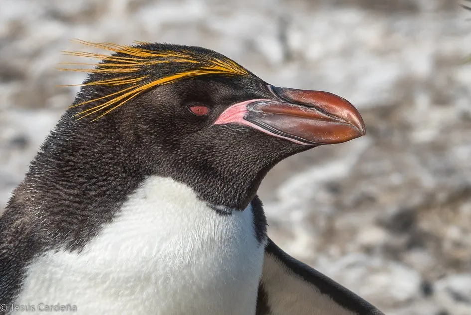 es el más pequeño de los pingüinos crestados. Su color es negro y blanco; alcanza una longitud de 55 cm y tiene un peso medio de 3.35 kg. Tiene la parte superior oscura coronada por cejas de plumas de color amarillo brillante que se proyectan hacia atrás sobre los ojos rojos. Crían en colonias, desde el nivel del mar hasta las cumbre de los cerros y, algunas veces, tierra adentro. Se alimentan de kril, calamar, pulpo, pescado, moluscos, plancton, sepia y crustáceos.