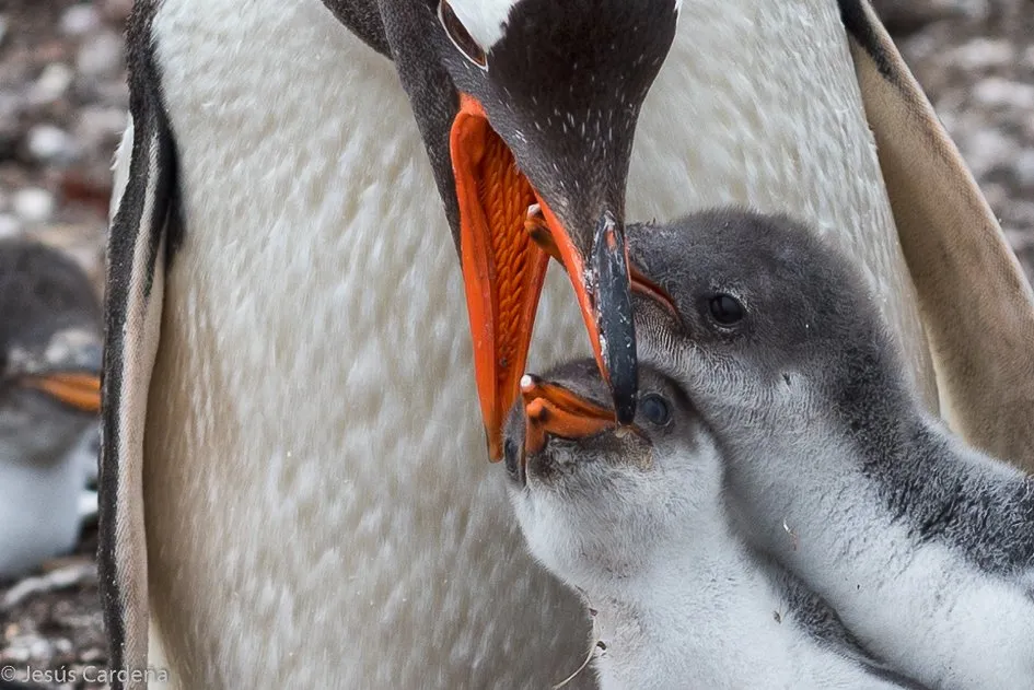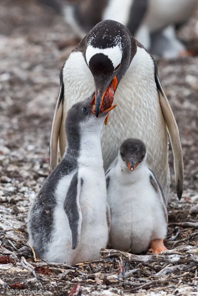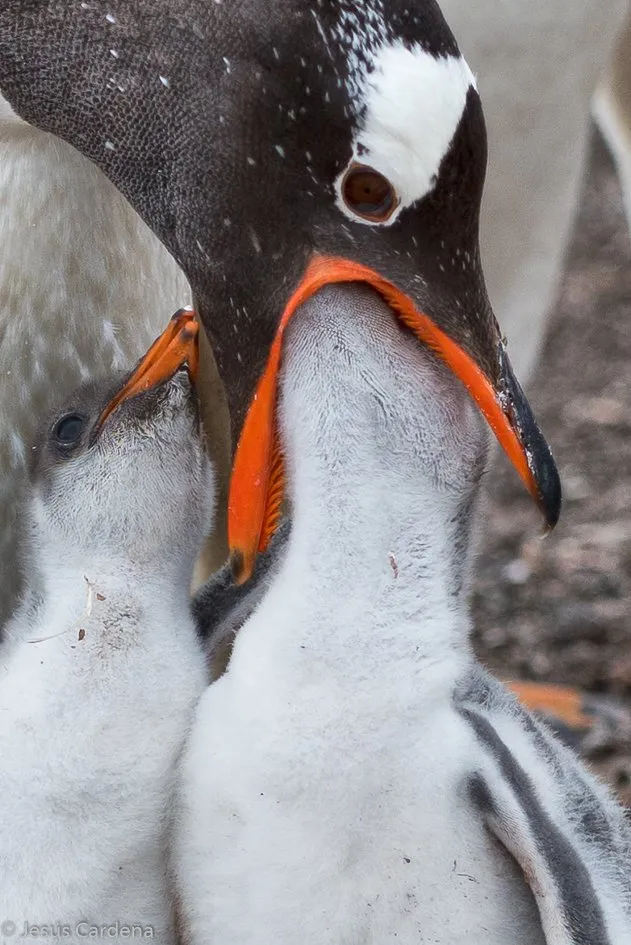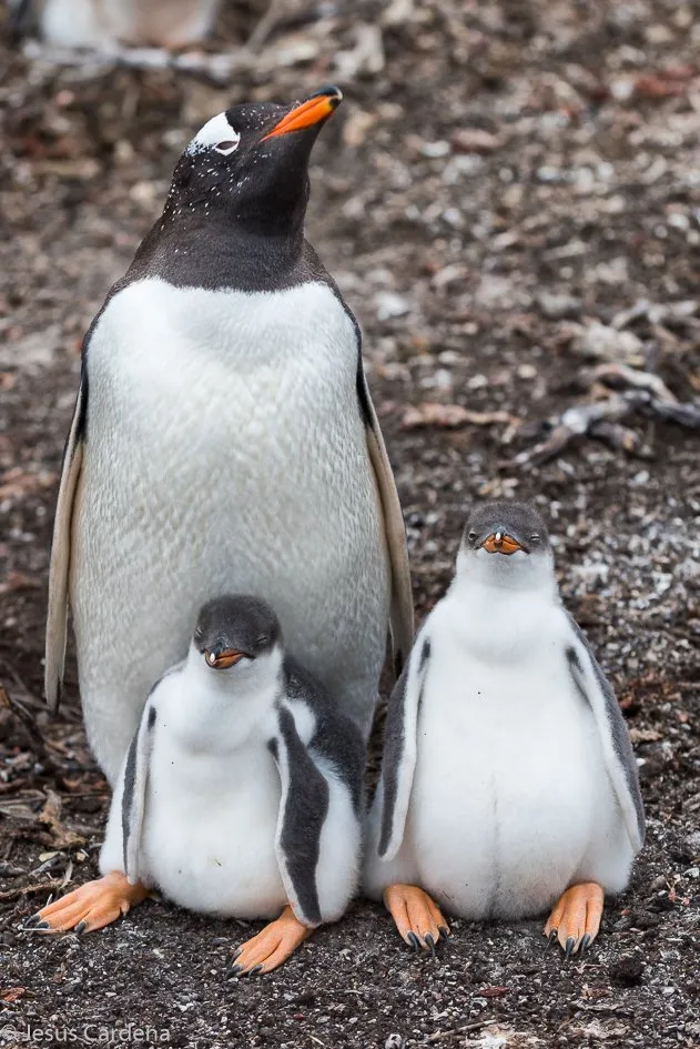 Las crías están cubiertas por un plumón grisáceo muy suave, que tiene la apariencia de pelo púbico. Viven hasta 100 años en estado natural. Se alimentan de krill, peces pequeños, etc.