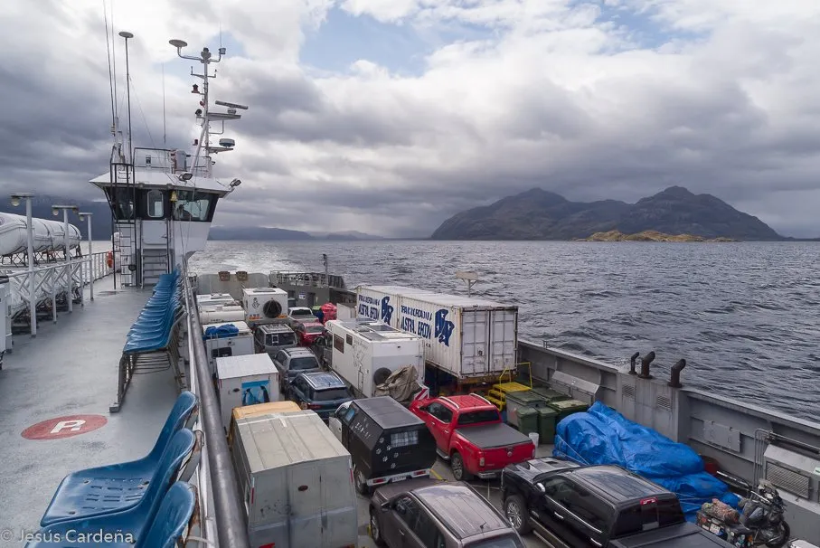 Enseguida se pone a llover y la Merche se balancea como una cama elástica. Carmen se levanta sobre la 6 para ver dónde estamos, no hace demasiado frío, pasamos por un fiordo estrecho pero está muy nublado. El ferry lleva en su centro tres filas de coches amarrados con eslingas a unos anillos al suelo, serán como 8 en cada fila, la Merche es la más larga, hay coches y más autocaravanas y alguna moto. A un lado está la cabina de pasajeros, 2 pisos, nosotros además de poder estar en la caravana, tenemos dos asientos en el piso de abajo, al lado de la ventana pero no se ve casi nada siempre está con vaho y sucia por la sal de fuera.