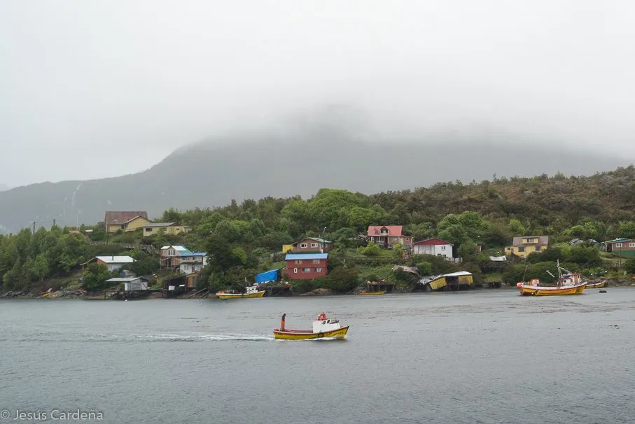A media mañana paramos en un pueblo costero, Puerto Edén, unas cuantas casas apiñadas al borde de la costa, accesibles entre ellas por pasarelas que recorren unos 150 m de costa. Nada de carreteras, coches, motos etc, solo llegas hasta aquí en barco. Es quizás el pueblo, si se puede llamar pueblo, más inaccesible que hayamos conocido. Tiene un paseo corto pero bonito por las pasarelas, lo hacemos bajo una lluvia intensa.
