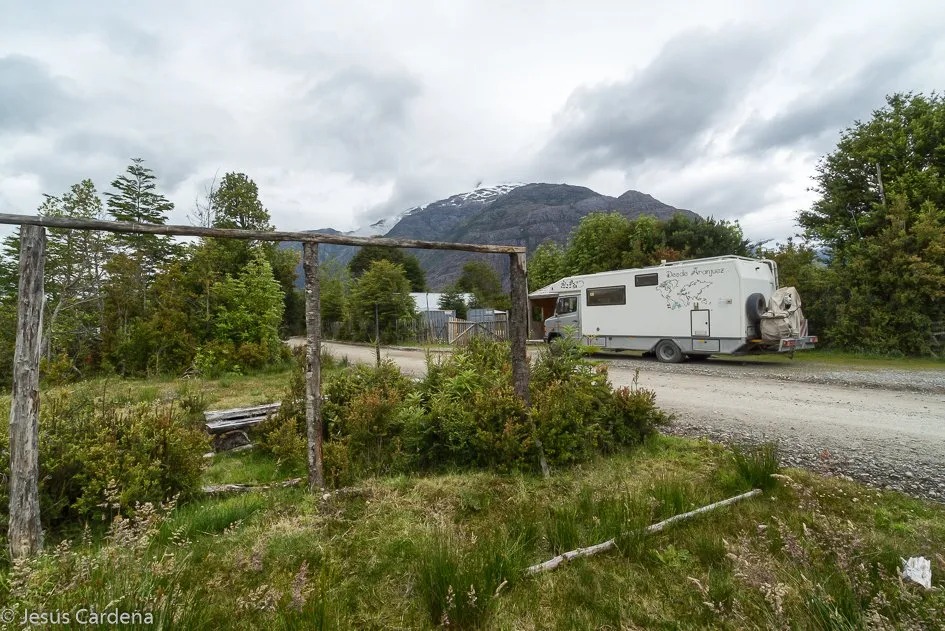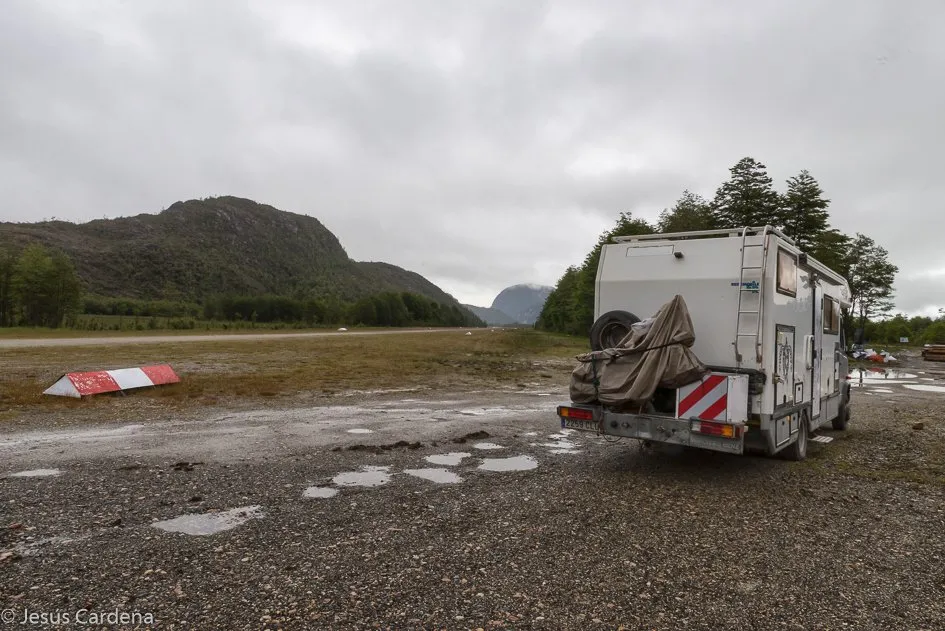 Llegando a Caleta Tortel vemos que va a ser imposible parar allí a sí que, muy cerca del pueblo, paramos al lado de una parada de autobús donde Claudio puede montas la tienda sobre el entarimado para aislarse de la humedad ya que sigue lloviznando.