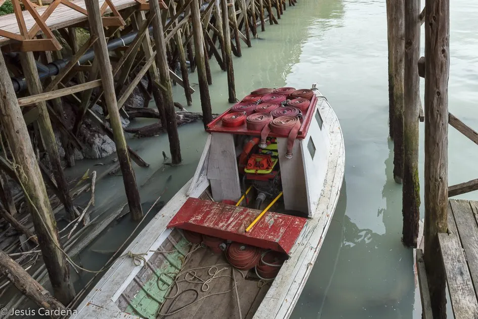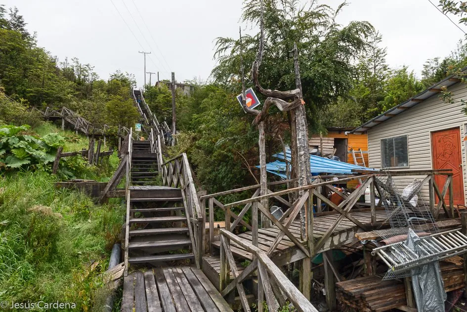 Bajamos por la pasarela que se inicia en al lado del centro información turística y recorremos la pasarela costanera. Sin calles definidas, este pueblo tiene lo que todo pueblo debe tener, colegio, ayuntamiento, plazas, bomberos, vemos alguna casa quemada, imaginamos sus problemas siendo de madera y calentándose con estufas de leña, incluso la pasarela termina en una pequeña playa donde tienen instalados un gimnasio callejero de los que tiene Chile en cualquier lugar que llegas.