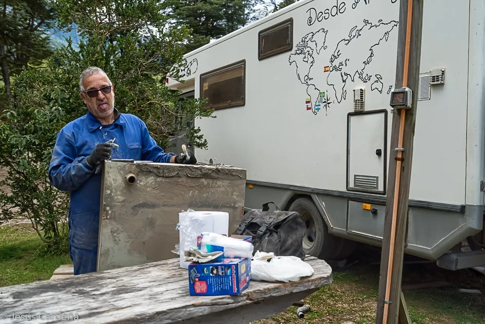 Después de desayunar nos ponemos al arreglo, esta vez colocamos bastante bien a la Merche y cuesta menos sacar el depósito y después colocarlo. Tiene un agujero en un lado que la verdad no sabemos cómo se ha podido hacer pues está en la zona donde estaba forrado. Da tiempo a la reparación y colocación sin problema.