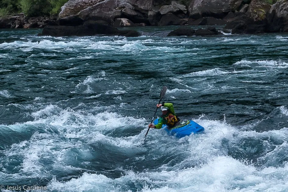 Aunque nos hubiéramos quedado allí más días, no podemos estar sin noticias y decidimos volver a la ruta y seguir hacia el norte. El camino de nuevo hasta la ruta 7 es especial, paramos dónde desemboca el río Azul, justo antes hay un puente y el paso del Diablo, un estrechamiento del río Futaleufu muy bonito. Después paramos más abajo y esperamos a que lleguen algunos kayak, el río está muy bajo y aún así lleva una fuerza que impresiona. Llegamos ya tarde a Santa Lucía, pasamos a un restaurante que ya no tiene comida pero si empanadas, tortillas, sopaipillas… Comemos y lloviendo toda la tarde buscaremos un lugar con buena señal para de nuevo seguir las noticias. Los datos abruman, el covid está matando a mucha gente, sobre todo ancianos