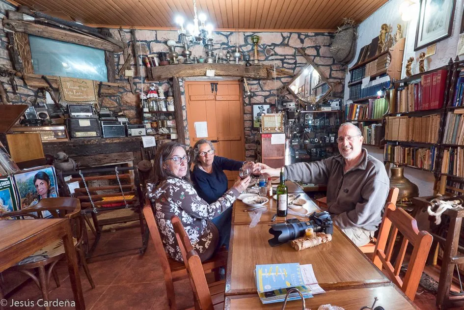 En frente del museo de los oficios, un museo donde una pareja ha ido recopilando distintos aparatos y artilugios de cualquier sitio durante muchos años. Todo es dispar y sin mucho orden. Una gran habitación con una chimenea encendida por lo que se percibe el olor de la leña y un calorcito muy apetecible. Hay antiguas emisoras de radio, máscaras africanas una gran variedad de cámaras de fotos antiguas y algún toma-vistas, candelabros, unas estanterías de libros sin ninguna catalogación, fotografías y discos de vinilo antiguos junto a una vieja gramola que el dueño hace funcionar con un disco de un cantante de tangos Uruguayo. Decidimos comer allí ya que también es restaurante y tienen habitaciones, comemos un guiso de jabalí que estaba riquísimo, regado con un vino de la zona de uva Tannat, una variedad que desconocíamos. La comida se hace muy agradable ya que el entorno es muy pintoresco, comimos en el mismos museo, rodeados de tantas cosas extrañas y al calor de la chimenea.