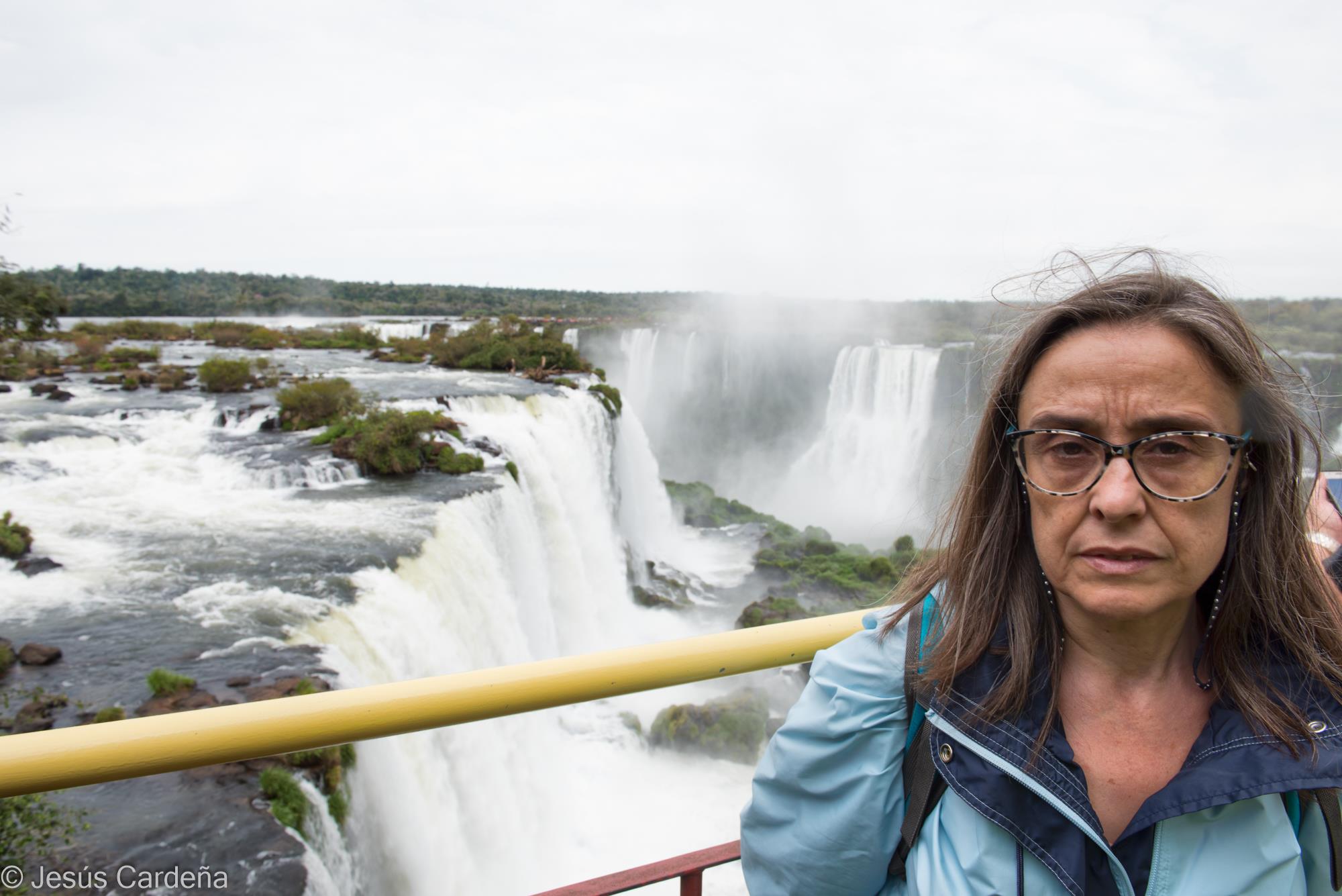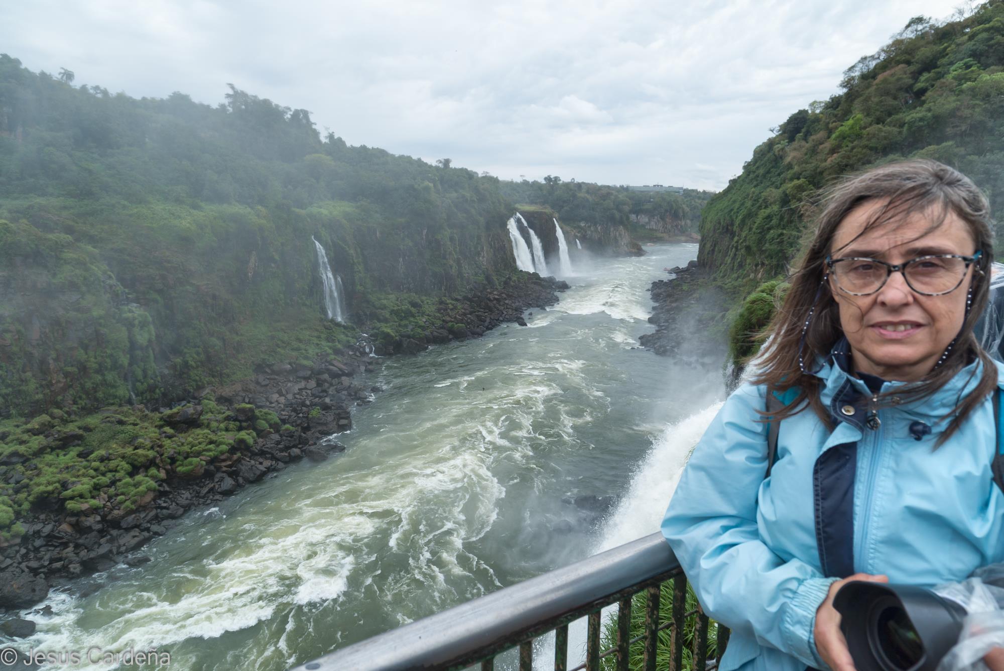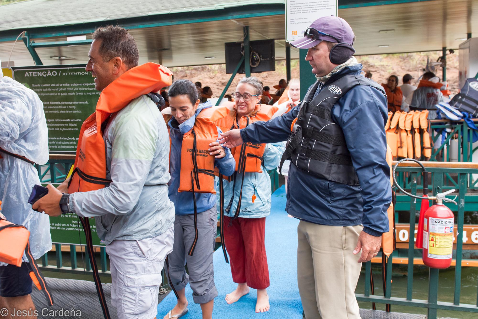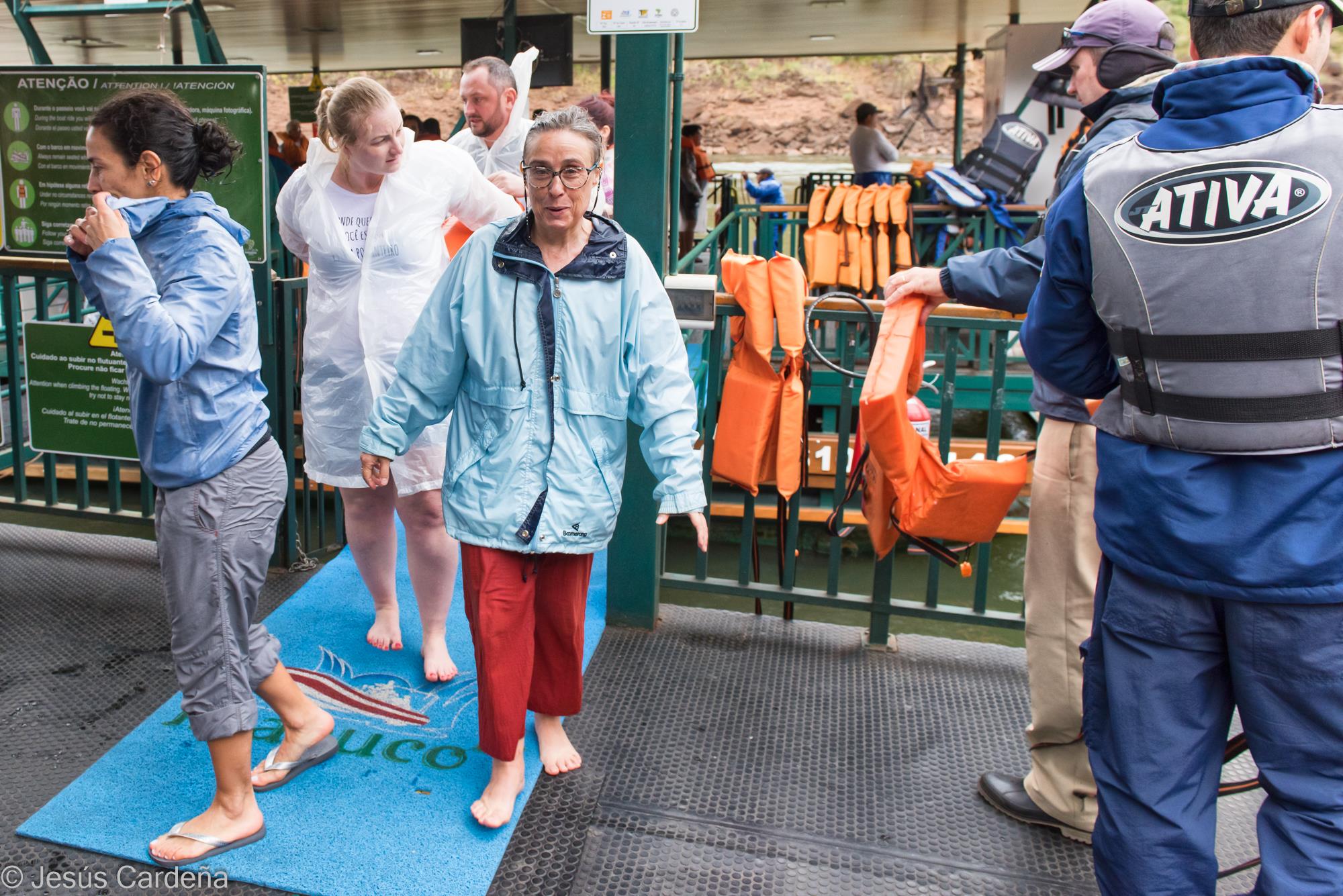 Tras dos horas alucinando con todos y cada uno de los saltos subimos de nuevo al bus que nos acerca hasta un lugar donde nos recogerá un tren eléctrico para, a través de la selva, bajar hasta el río. Hay una opción de bajar del tren unos 400 metros antes para andar un recorrido muy encorsetado y desnaturalizado con pésimas explicaciones, nosotros optamos por este paseo. Al llegar al embarcadero te ofrecen viaje en seco o mojado, Carmen, ¡como no! hace el mojado, Jesús no puede a causa de las cámaras y además prefiere sacar fotos. El paseo es especial, te suben río arriba hacia las cataratas, como 1 km de aguas bravas, para acercarse lo máximo posible a la derecha de isla de San Martín para ver las caídas de este lado, sobre todo “Tres Hermanas” para después adentrarse cerca a la “Garganta del Diablo”, lugar del río donde comienza todo y el lugar más espectacular. La barca de Carmen llega hasta debajo mismo de las cascadas, nosotros lo podemos ver desde nuestra barca, la barca de Carmen se pierde entre la lluvia provocada por tan inmensa cascada, después nos comentaría que fue una ducha total y un ruido ensordecedor. La vuelta hasta el embarcadero también impresiona por la rapidez, la verdad es que los capitanes manejan increíble.