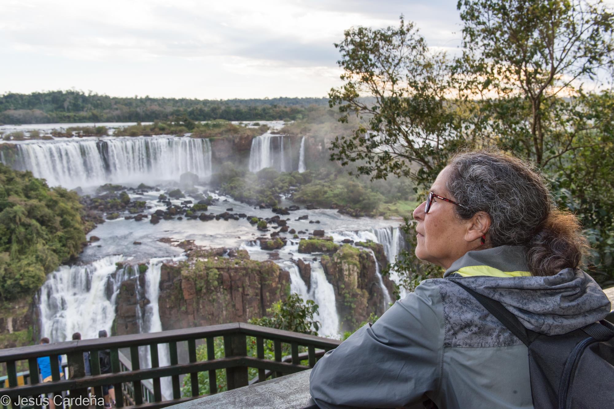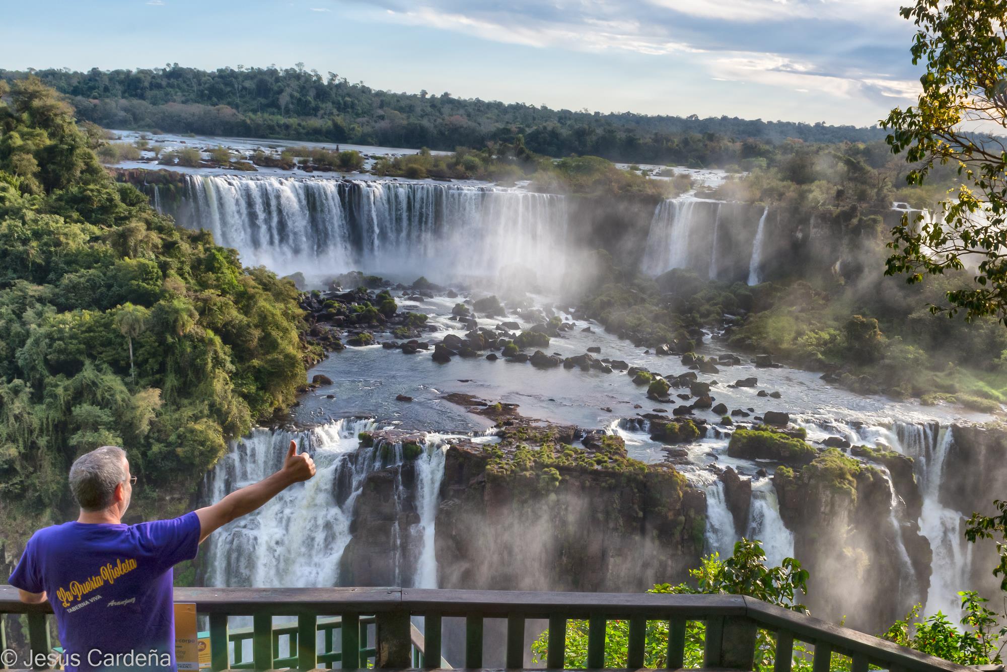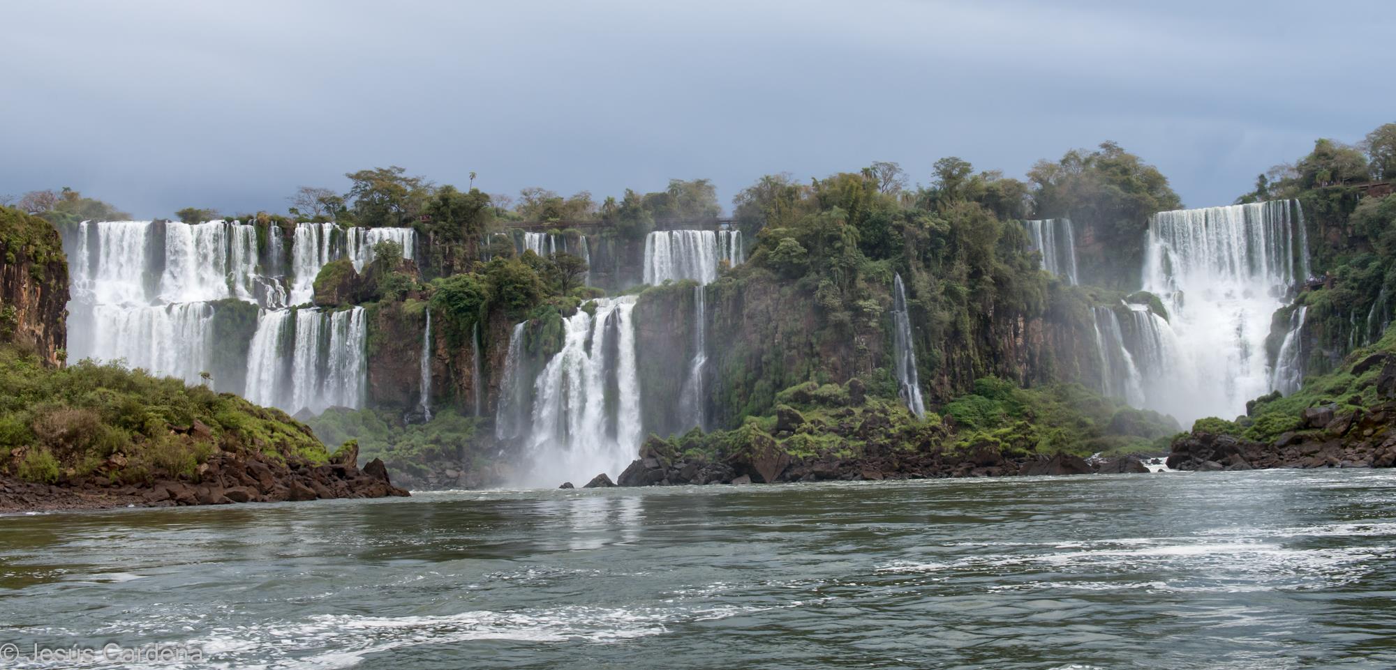 Tras dos horas alucinando con todos y cada uno de los saltos subimos de nuevo al bus que nos acerca hasta un lugar donde nos recogerá un tren eléctrico para, a través de la selva, bajar hasta el río. Hay una opción de bajar del tren unos 400 metros antes para andar un recorrido muy encorsetado y desnaturalizado con pésimas explicaciones, nosotros optamos por este paseo. Al llegar al embarcadero te ofrecen viaje en seco o mojado, Carmen, ¡como no! hace el mojado, Jesús no puede a causa de las cámaras y además prefiere sacar fotos. El paseo es especial, te suben río arriba hacia las cataratas, como 1 km de aguas bravas, para acercarse lo máximo posible a la derecha de isla de San Martín para ver las caídas de este lado, sobre todo “Tres Hermanas” para después adentrarse cerca a la “Garganta del Diablo”, lugar del río donde comienza todo y el lugar más espectacular. La barca de Carmen llega hasta debajo mismo de las cascadas, nosotros lo podemos ver desde nuestra barca, la barca de Carmen se pierde entre la lluvia provocada por tan inmensa cascada, después nos comentaría que fue una ducha total y un ruido ensordecedor. La vuelta hasta el embarcadero también impresiona por la rapidez, la verdad es que los capitanes manejan increíble.