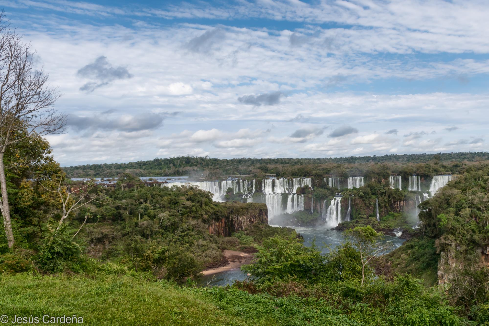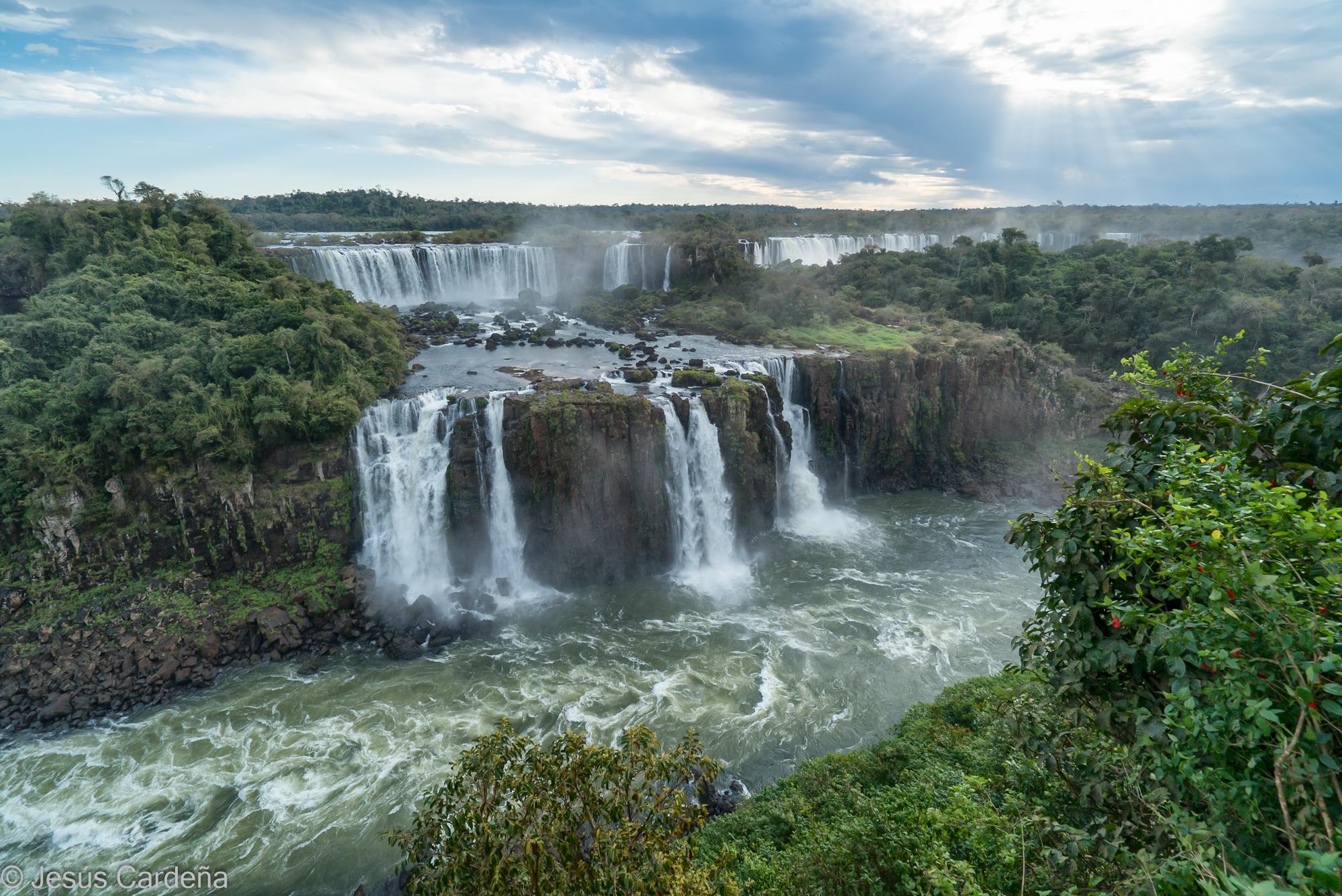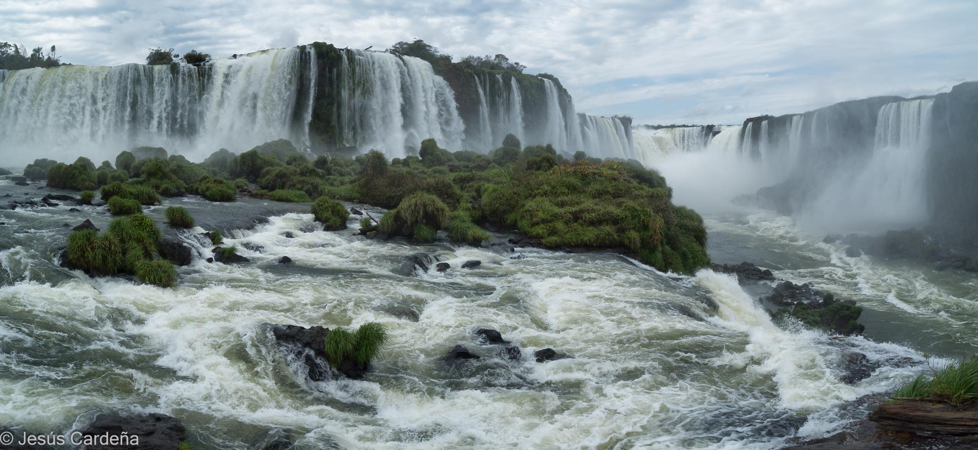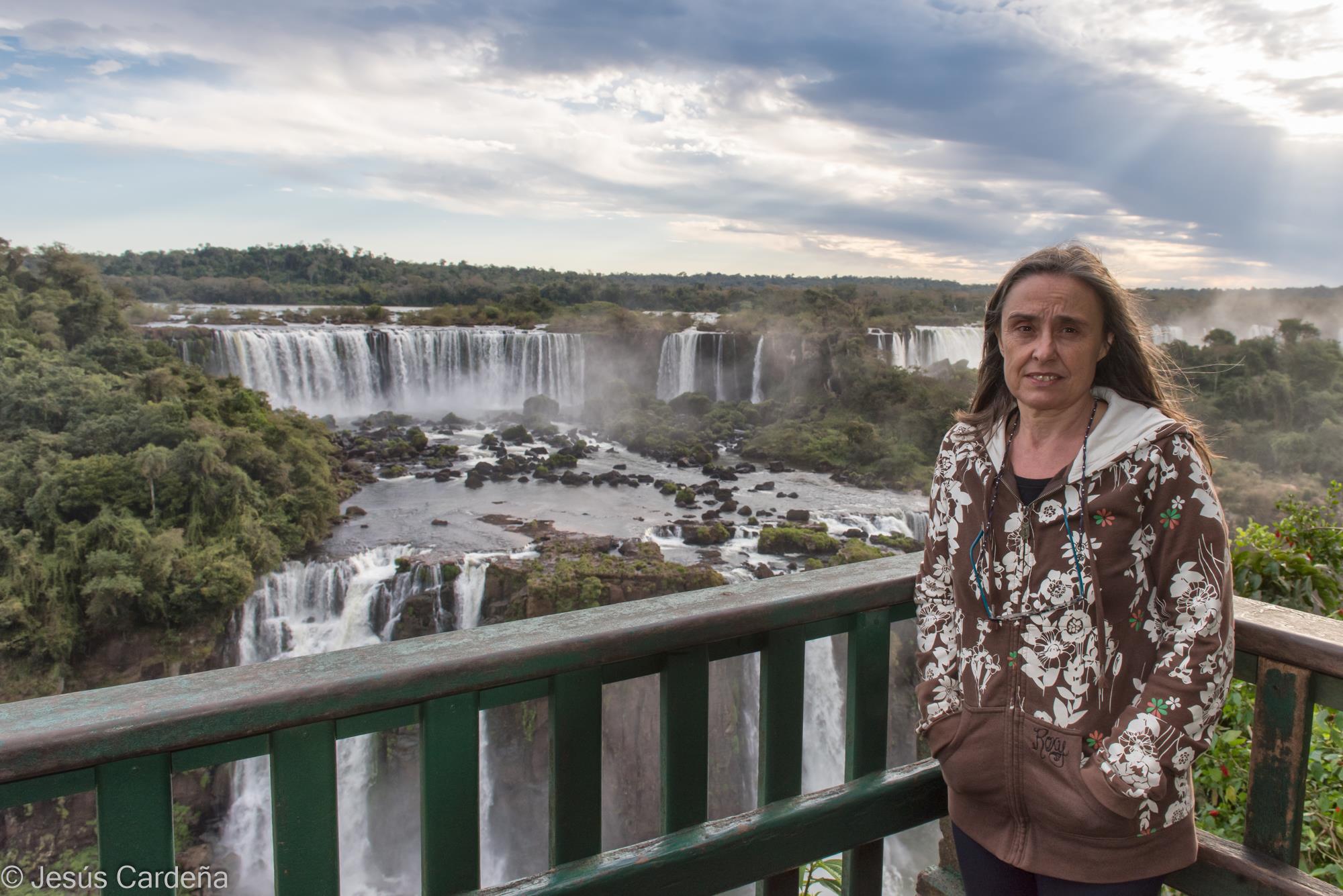 Tras dos horas alucinando con todos y cada uno de los saltos subimos de nuevo al bus que nos acerca hasta un lugar donde nos recogerá un tren eléctrico para, a través de la selva, bajar hasta el río. Hay una opción de bajar del tren unos 400 metros antes para andar un recorrido muy encorsetado y desnaturalizado con pésimas explicaciones, nosotros optamos por este paseo. Al llegar al embarcadero te ofrecen viaje en seco o mojado, Carmen, ¡como no! hace el mojado, Jesús no puede a causa de las cámaras y además prefiere sacar fotos. El paseo es especial, te suben río arriba hacia las cataratas, como 1 km de aguas bravas, para acercarse lo máximo posible a la derecha de isla de San Martín para ver las caídas de este lado, sobre todo “Tres Hermanas” para después adentrarse cerca a la “Garganta del Diablo”, lugar del río donde comienza todo y el lugar más espectacular. La barca de Carmen llega hasta debajo mismo de las cascadas, nosotros lo podemos ver desde nuestra barca, la barca de Carmen se pierde entre la lluvia provocada por tan inmensa cascada, después nos comentaría que fue una ducha total y un ruido ensordecedor. La vuelta hasta el embarcadero también impresiona por la rapidez, la verdad es que los capitanes manejan increíble.