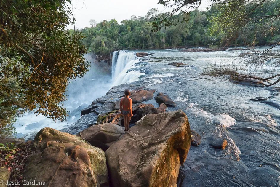 Toda la noche oyendo el estruendo del tremendo salto que tenemos a 20 m de nosotros, el salto del Ñacunday en el río Ñacunday, a unos 500 m de aquí desemboca en el Paraná. Una sensación contradictoria por un lado el estruendo de la naturaleza pero por otro no te deja escuchar otros sonidos propios de ella y estamos completamente solos, a 2 km está la casilla de los guardabosques donde no sabemos si pasan la noche. Carmen pasa gran parte de la mañana a la orilla del rio a 5 metros del salto de agua e la parte de arriba y Jesús con las fotos y el diario.