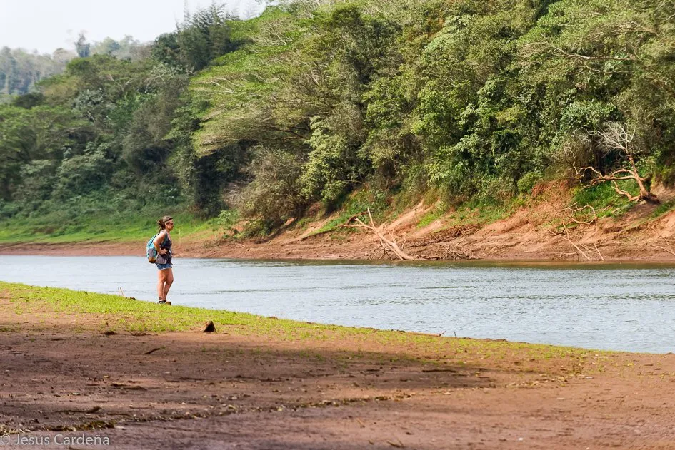 El día está siendo muy caluroso, bajamos por el camino que tienen hecho los guardas hasta el río para ver la cascada desde abajo, allí podemos apreciar que a pesar del agua que baja, el río está bastante bajo, quizás un metro más bajo de lo normal, hay mucha sequía.