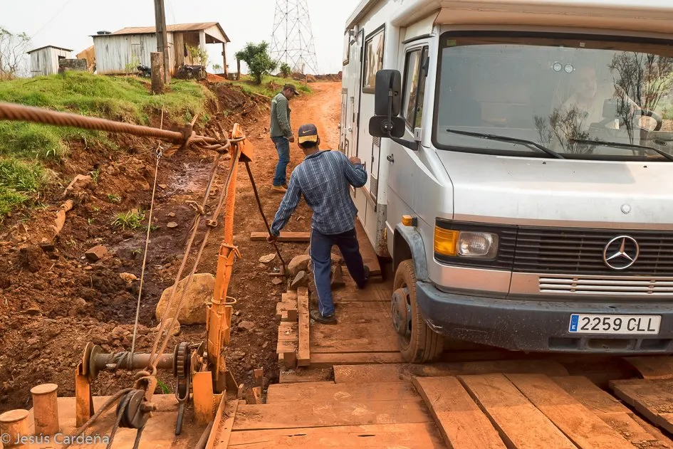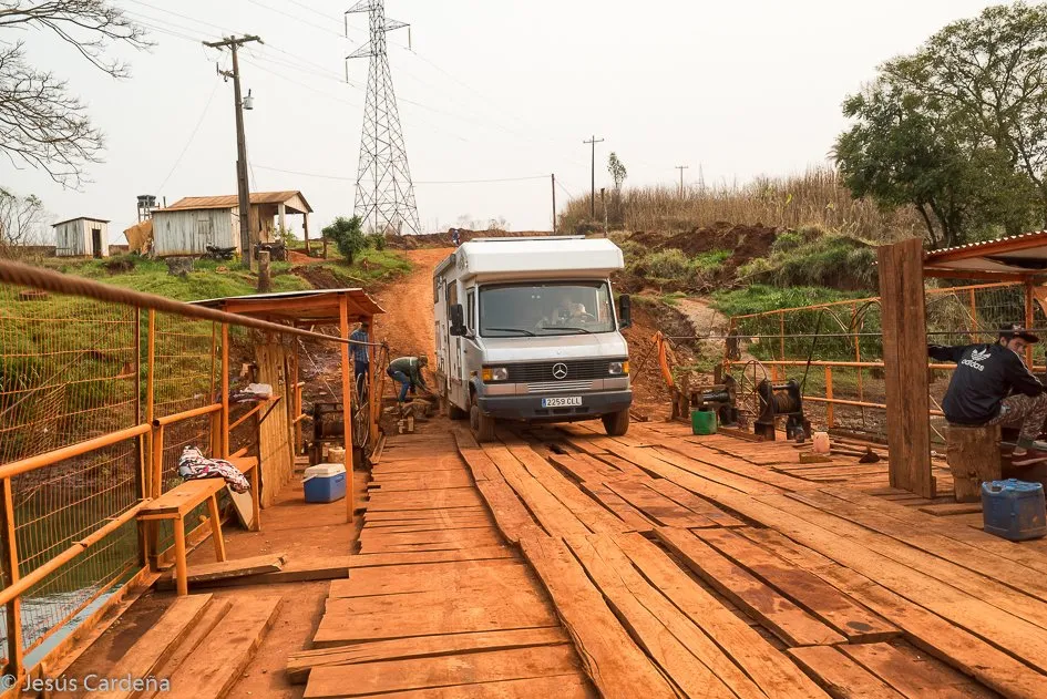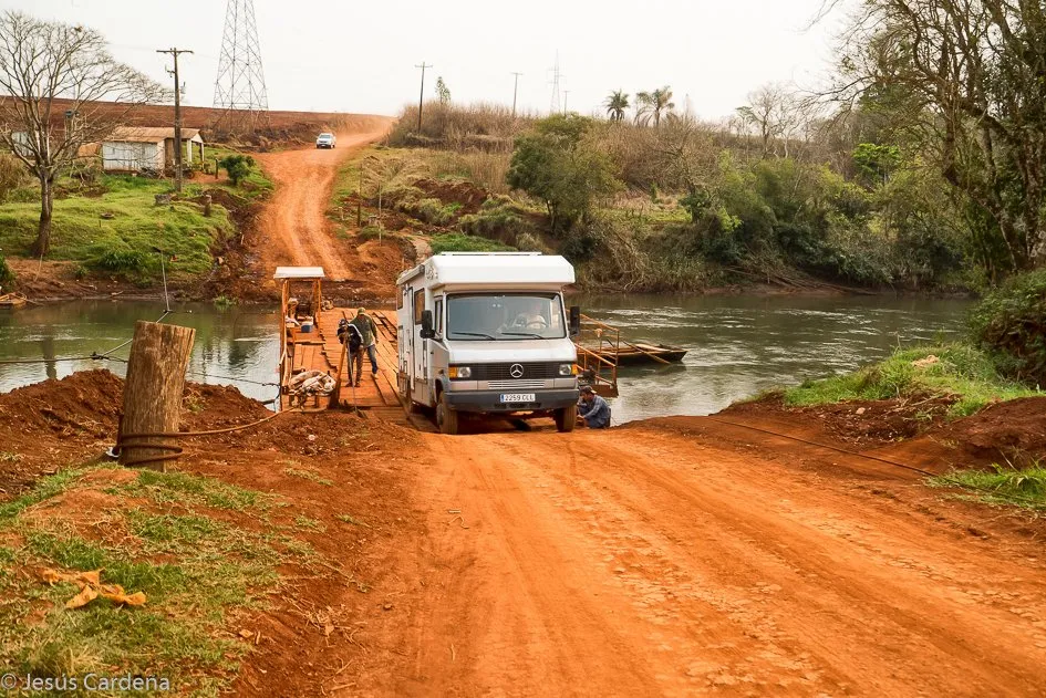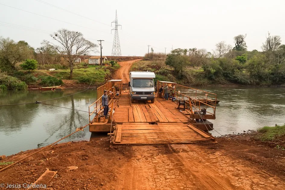 En la salida del parque preguntamos al guardaparques cual es el mejor camino para ir hacia el sur y nos dice que si vamos al sur tenemos que pasar el río con una balsa, pero que no hay problema pues pasan camiones grandes, bueno pues allá que vamos!. La balsa es para camiones sí, pero el río es el Ñacunday y está muy bajo, cómo un par de metros o más, la rampa de acceso a la balsa es muy pronunciada tanto de subida como de bajada, Jesús advierte a los barqueros que podemos dar con el paragolpes trasero, estos dicen que no pasa nada que ponen tablones para elevar a la Merche así que con un poco de preocupación nos ponemos manos de los barqueros, Carmen cámara en mano viendo desde fuera la maniobra. Quitan tablones de la misma balsa para ponerlos en la ruedas de atrás, en una de esas el tablón se abre y el paragolpes trasero choca contra el suelo y como está en pleno movimiento éste se retuercen y también se dobla una protección de hierro de la parte de abajo, pero pasar, pasamos!.