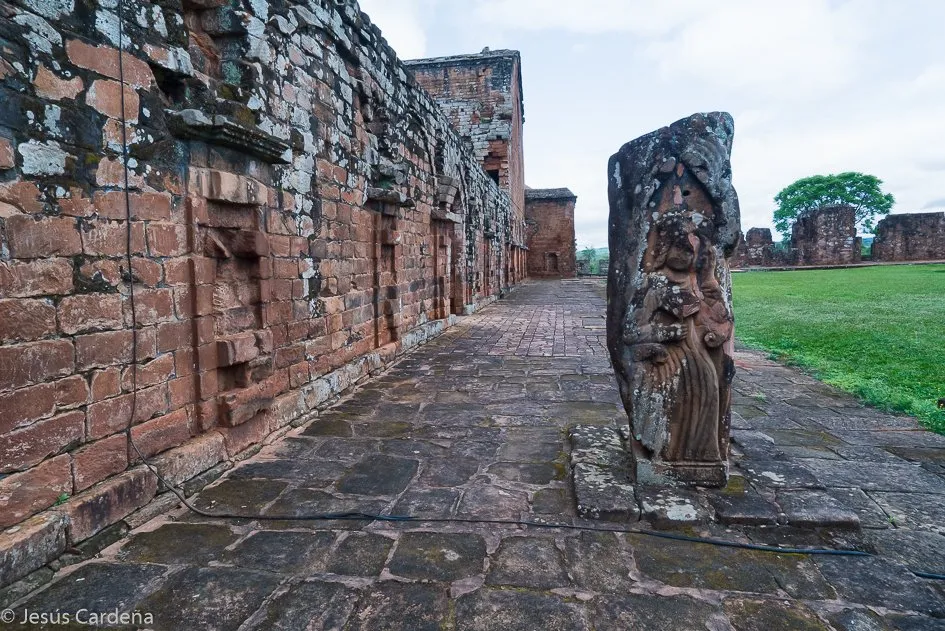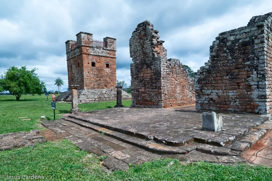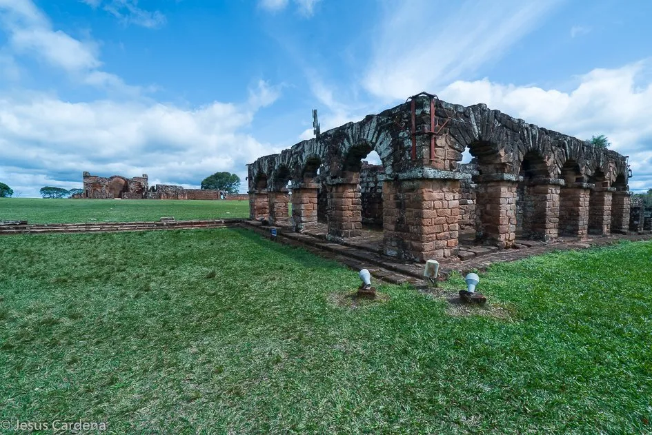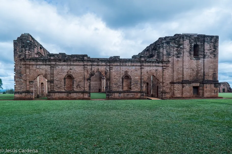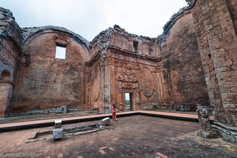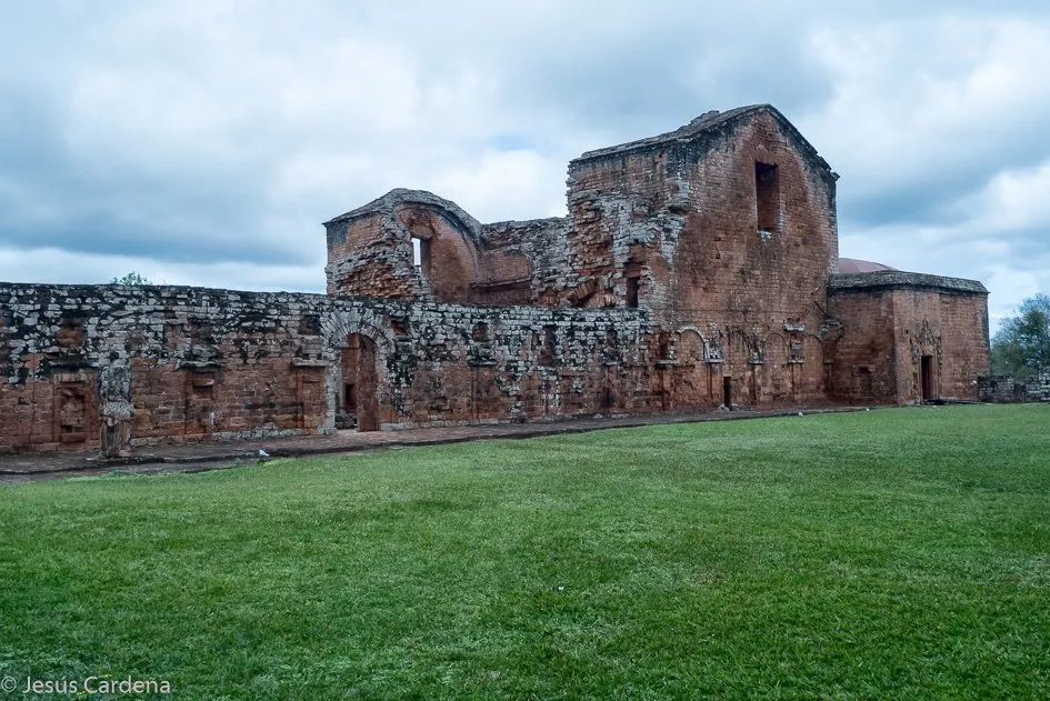 Después iremos a Jesús de Tavarangüe, tavarangüe en guaraní significa inacabado, porque está reducción nunca se terminó, trabajaron los 10 últimos años de los jesuitas en esta zona y cuando son expulsados lo dejan a medias. La iglesia nunca se techa pero se ve claramente que el estilo es más sobrio, destaca los arcos de la puerta que son trilobulados, se estaban utilizando en la España mozárabe. Todo está muy bien conservado y despejado.