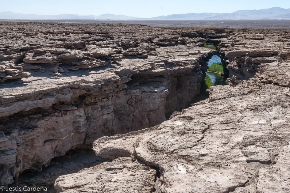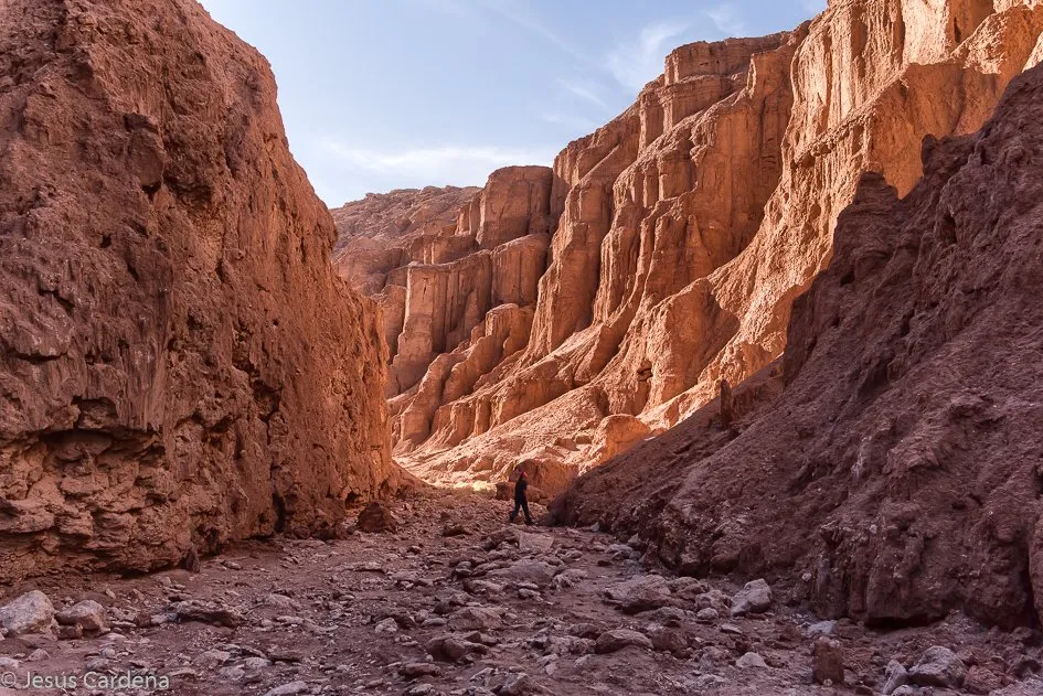 Noche fresquita y silenciosa, salimos para San Pedro, tenemos que dar las cosas que tenemos a Gonzalo. Nos vamos con Gonzalo a buscar una pizzería que termina siendo un local típico con familias chilenas comiendo, terminamos muy tarde y Gonzalo nos anima a ir a ver las grutas que nos prometió, así que ya tarde salimos. La entrada está en la carretera al lado de un mirador, hace calor todavía y el sendero no tiene sombras, paisaje típico de San Pedro con esas rocas llenas de aristas por cristales sobretodo de sal mezclada con arena muy compacta. Llegamos a las grutas, se aprecian grandes agujeros por los que trepar para salir por otro lugar, Jesús y Gonzalo lo hacen y Carmen les espera en la salida. Increíble los sonidos de la roca, constantemente se oye crujir, son los sonidos de la erosión, Gonzalo dice que son los espíritus que nos dan la bienvenida. Comienzan a entrar las sobras del atardecer y empieza a refrescar. Seguimos recorriendo el lugar y damos con a una antigua mina de cobre, “Cuevas de Chulacao”, que funcionaba con los antiguos pobladores hasta hace pocos años, Se ven los huecos en la roca dónde estaban las vetas, también hay zonas de esmeralda, piedras verdes con un color muy bonito. Salimos ya tarde, Jesús hace una foto del atardecer para bajar de nuevo a la plaza donde, ya si, pasamos la última noche en San Pedro.