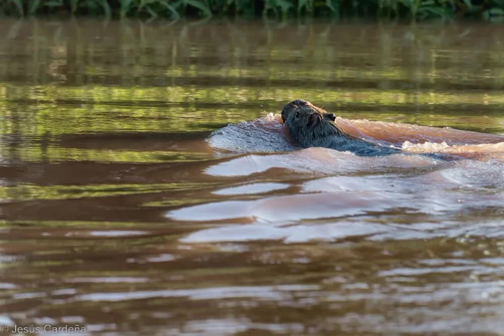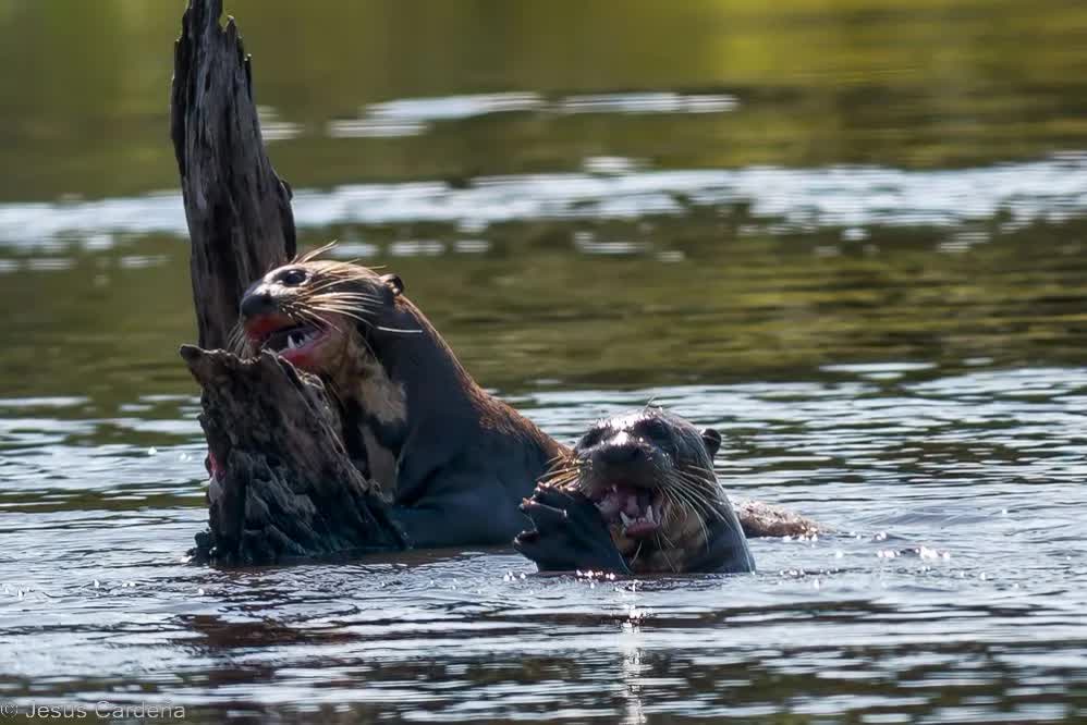 Hoy nos levantamos temprano para hacer otro tour por el río, son las 8 de la mañana cuando nos sentamos en la barca con un sol y calor de justicia, no son horas para encontrar animales con este calor, algún mono, iguanas en los árboles y muchos pájaros. Vamos ahora río arriba llegando a una zona donde aparece un afluente con el agua de color rojizo que al mezclarse con el rio verdoso pasa a ser de color marrón característico de estos ríos, lo llaman Río Vermelho. Hay zonas donde se estrecha y hay muchos nenúfares, de repente vemos una hermosa nutria, subida a un tronco que sobresale en el río comiendo un enorme pescado, creemos que es una piraña, no parece importarle nuestra presencia y sigue comiendo el enorme pez enseñándonos sus afilados dietes. Al rato aparece otra que juguetea a su lado como pidiéndola que le dé un poco del delicioso pescado.