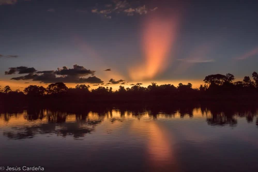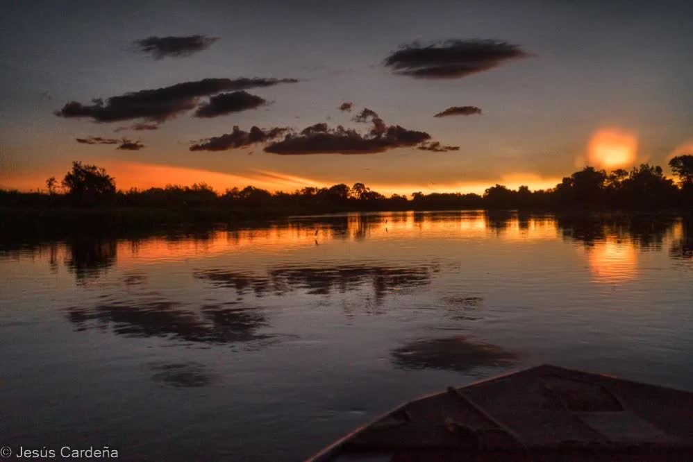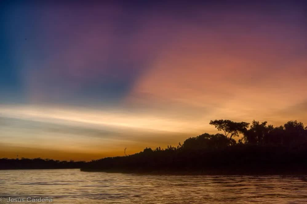 A la tarde volvemos a hacer la navegación nocturna, el resultado es el mismo del día anterior, ni rastro del Jaguar, pero un atardecer precioso de tonos amarillos, naranjas y azules sobre unas nubes de terciopelo.