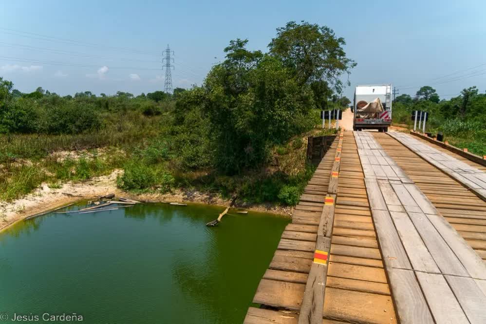 Salimos después de hacer unas compras, nos esperan 250 km hasta el Pantanal, la carretera no está mal hasta llegar al cruce dónde termina el asfalto comienza una carretera de ripio con puentes de madera, algunos en muy mal estado, para salvar las charcas y riachuelos que además están habitados por jacarés.