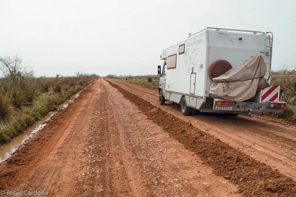 Una ruta de acceso al Iberá; notar la tierra roja en el suelo despejado de vegetación.